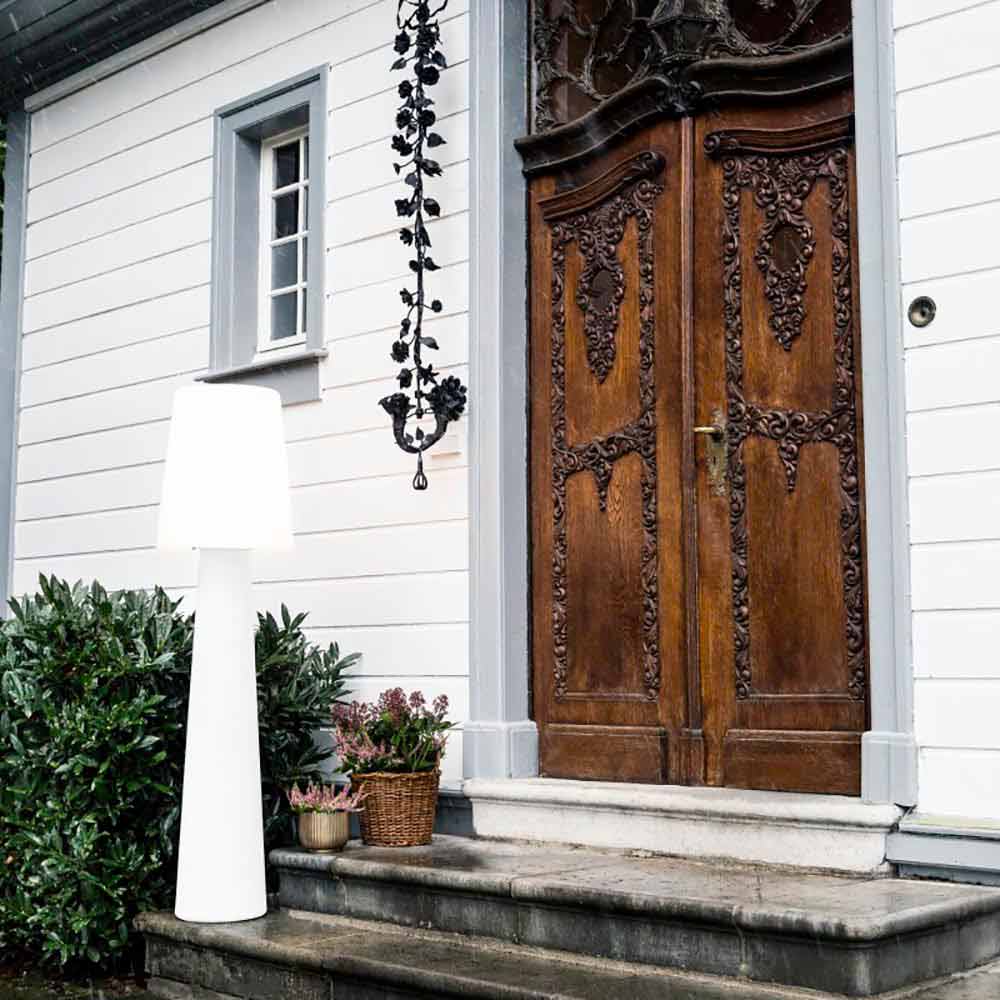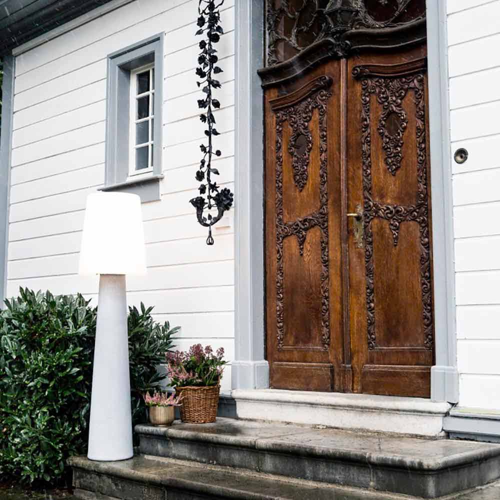 Diese Stehlampe zeichnet sich durch ein zeitgemäßes und zeitloses Design aus , das eine perfekte und elegante Atmosphäre sowohl im Innen- als auch im Außenbereich schafft .