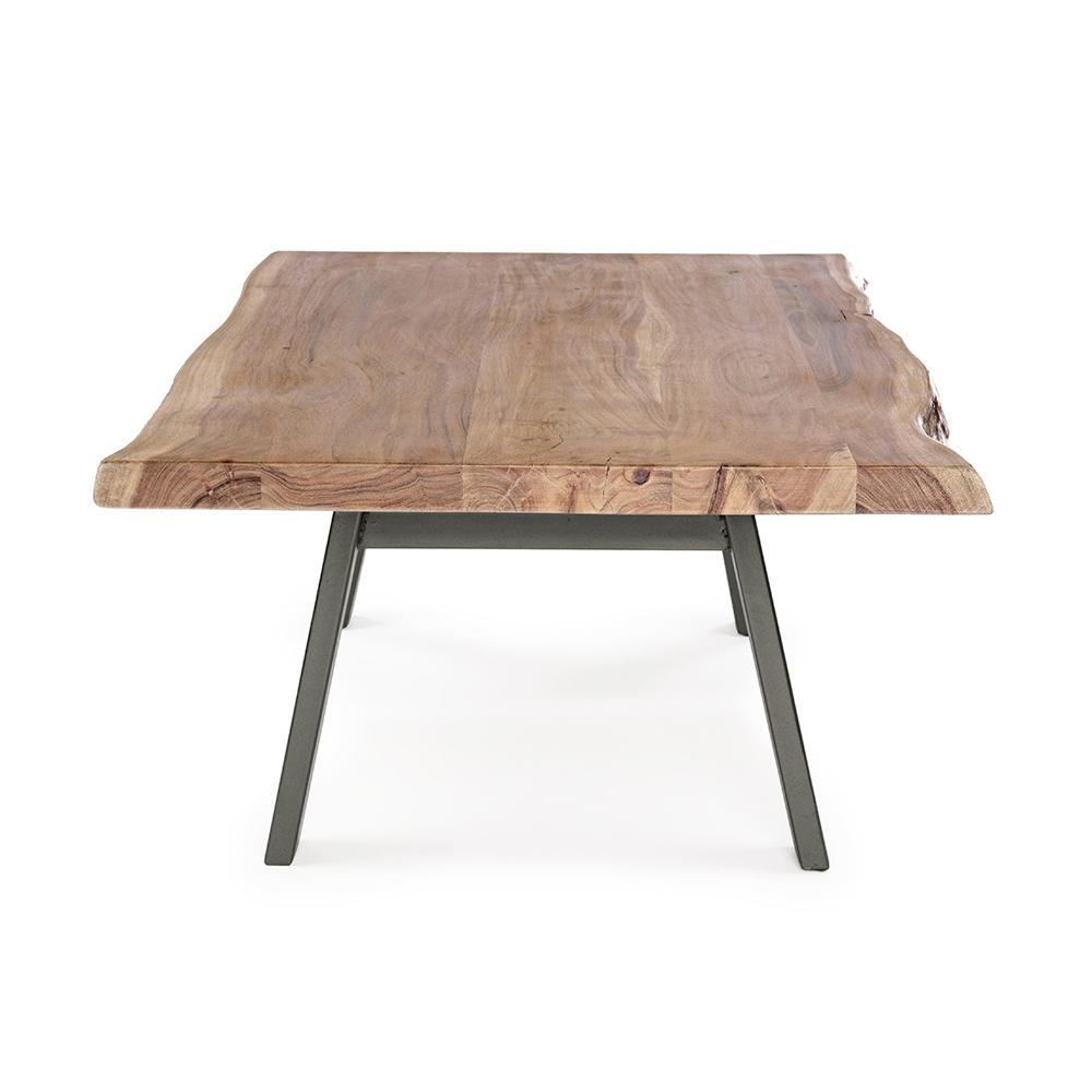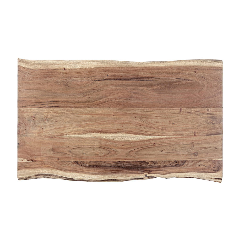 Sein eigentliches Hauptmerkmal ist die Akazienholzplatte mit unregelmäßigen Kanten (Living Wood-Effekt), die in Handarbeit mit einem Finish auf Polyurethanlackbasis hergestellt wurde.