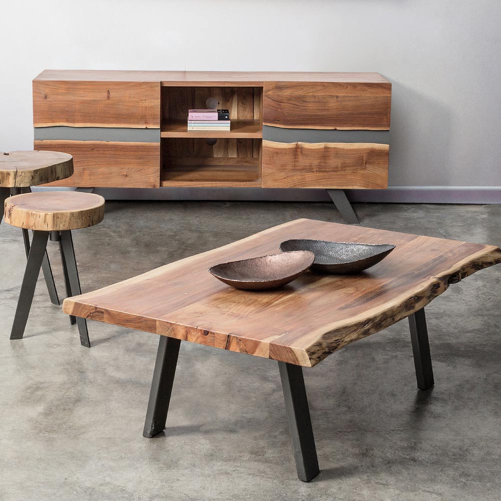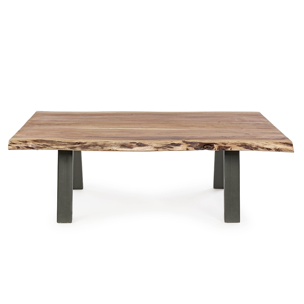 Couchtisch aus handgefertigtem Akazienholz und Stahlbeinen.