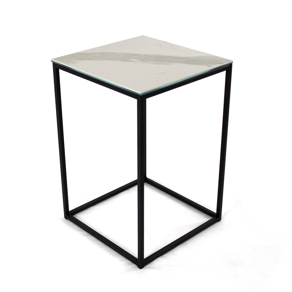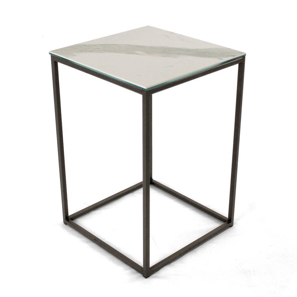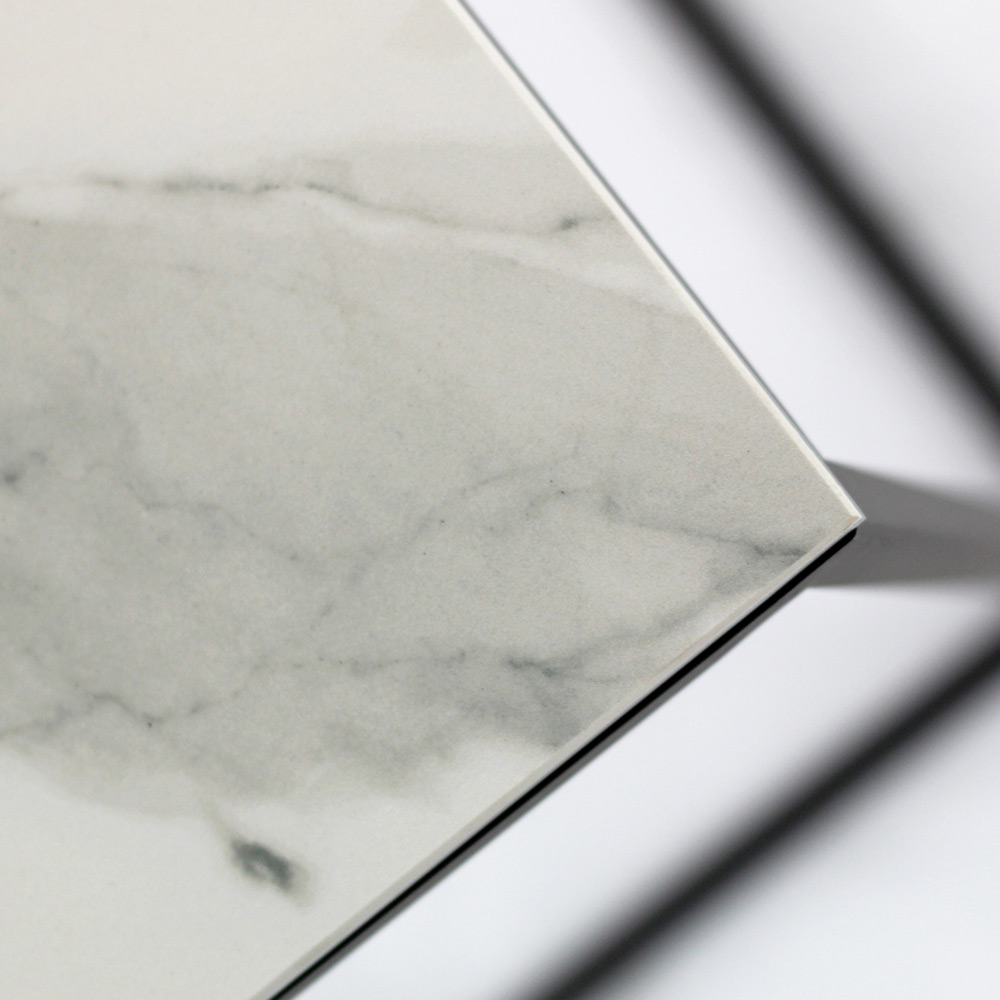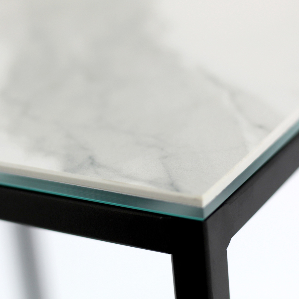 Quadratischer Couchtisch mit lackiertem Stahlsockel und Tischplatte aus 3 mm dickem, matt geädertem Steinzeug in Statuenweiß, laminiert mit 6 mm dickem Floatglas. Die Couchtische im modernen Stil stellen das perfekte Möbelstück dar, um die Dekoration jedes Wohn- und Wohnzimmers zu vervollständigen. Diese Produkte sind einzigartig, elegant und funktional zugleich, dank ihrer einfachen und harmonischen Verarbeitung, die sie für jeden Bedarf und Anlass geeignet macht. Die für die Konstruktion verwendeten Materialien garantieren auch im Laufe der Zeit eine hohe Qualität und Widerstandsfähigkeit.