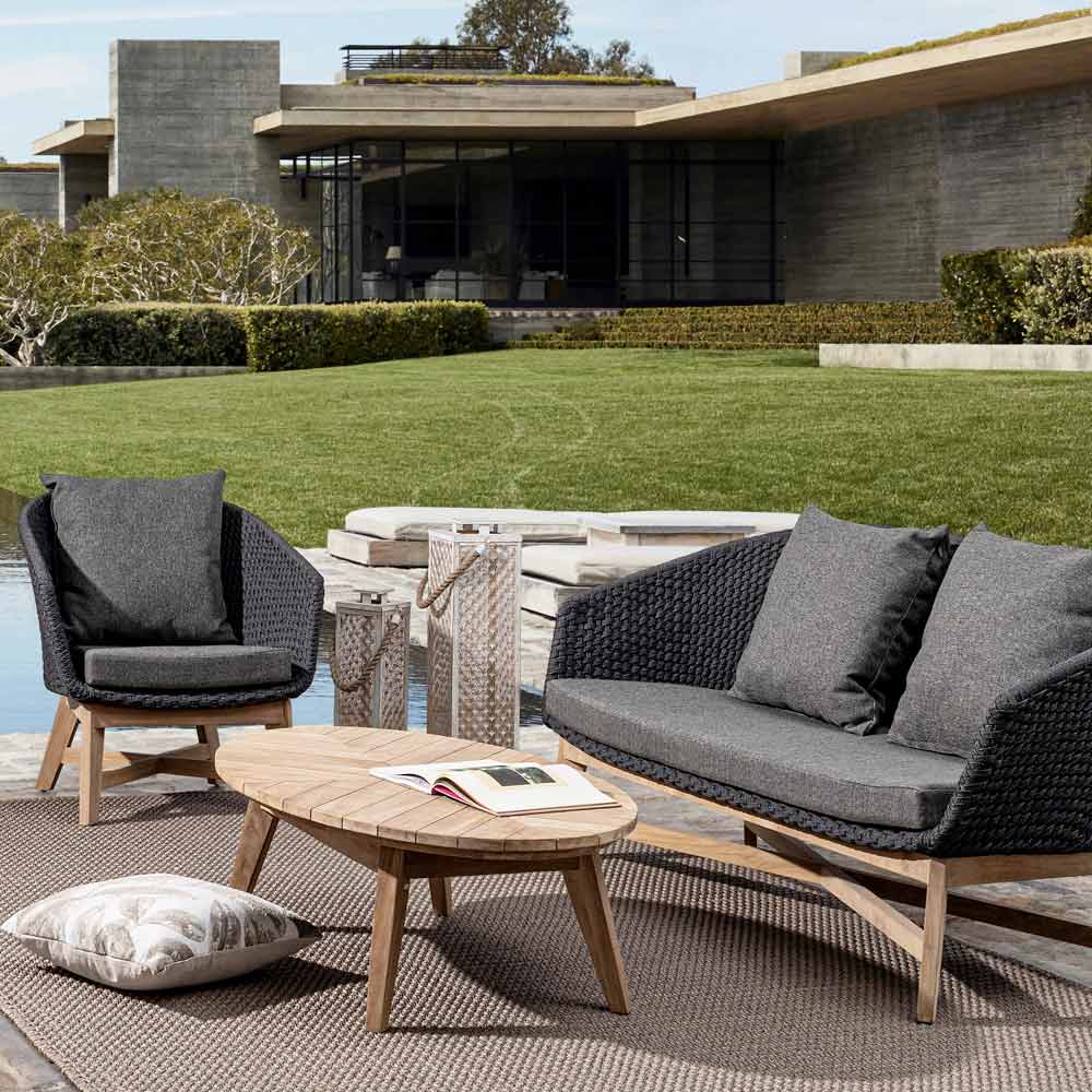 Couchtisch im Freien aus Teakholz mit ovaler Platte.