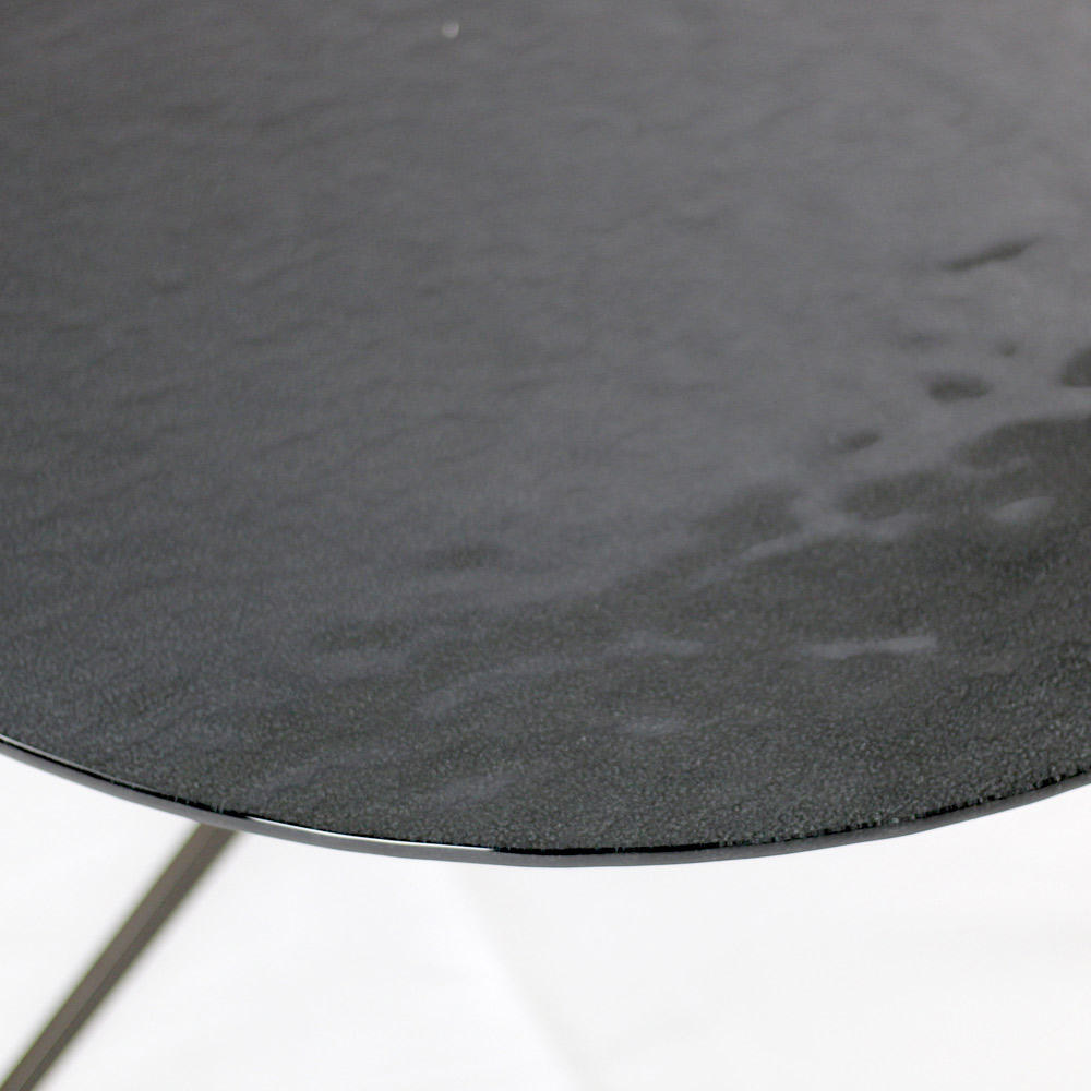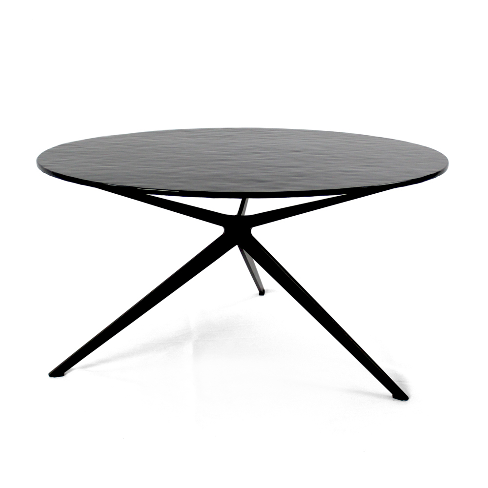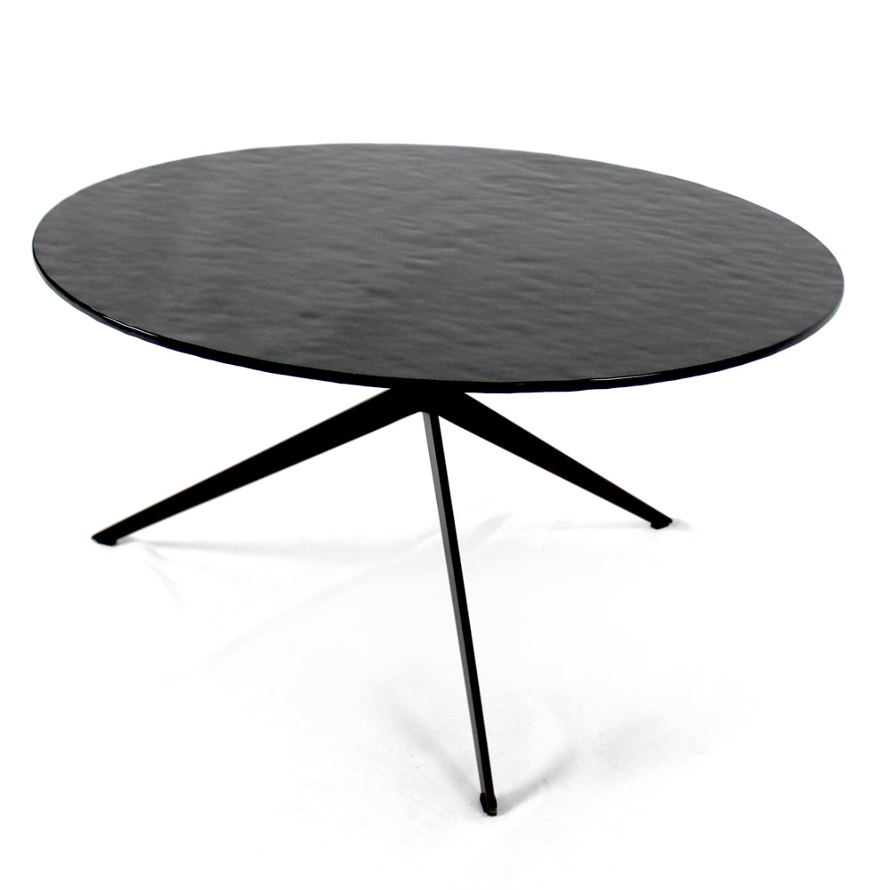 Runder Couchtisch mit lackiertem Stahlsockel und Glasplatte.