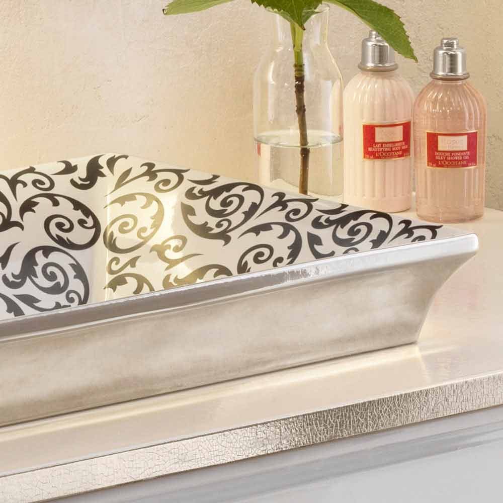 NB: Fire Clay ist ein Keramikmaterial der Kategorie Steinzeug, das aus unreinem Kaolin hergestellt wird. Es ist in seiner ganzen Masse wie Porzellan verglast. Halbeinbauwaschbecken im moderenen Design hergestellt in IItalien, Guido Waschbecken aus Fire Clay innen mit Ornamenten Blumen handbemalt und aussen im Platin Finish.