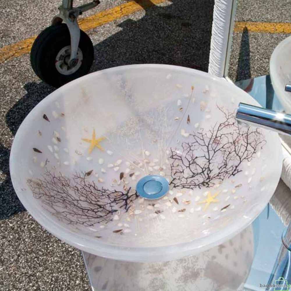 Waschbecken aus transparentem Opalharz mit Einschlüssen von Korallen, Muscheln und Seesternen.