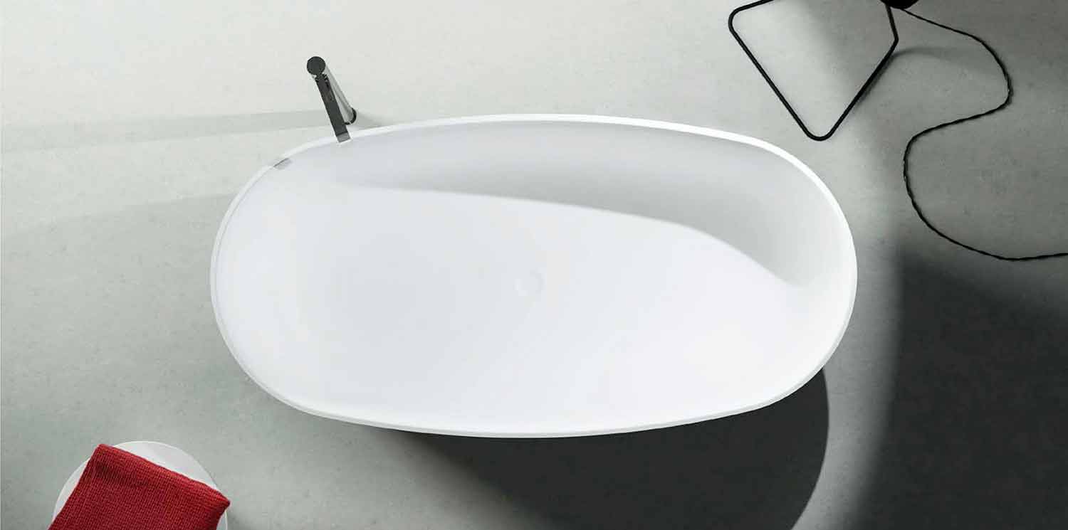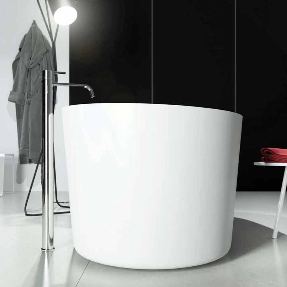 Moderne freistehende Monoblock-Badewanne, hergestellt in Italien, Dongo Dongo ist eine Monoblock-Badewanne mit freistehender Installation in Solid Surface. Das Design zeichnet sich durch Linien und skulpturale Formen aus, die sich perfekt in Ihr Badezimmer einfügen.