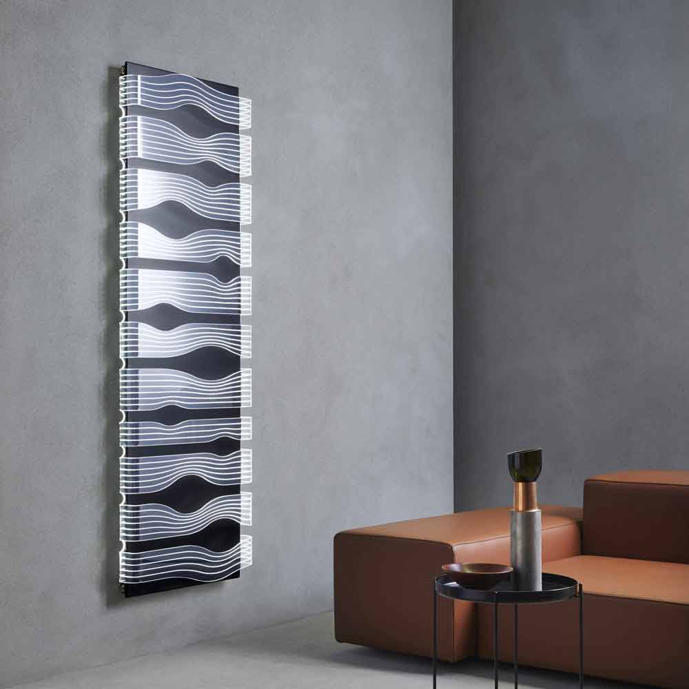 Moderner elektrischer Heizkörper mit vertikalem Design und LEDs für Wohnzimmer oder Badezimmer, hergestellt in Italien.