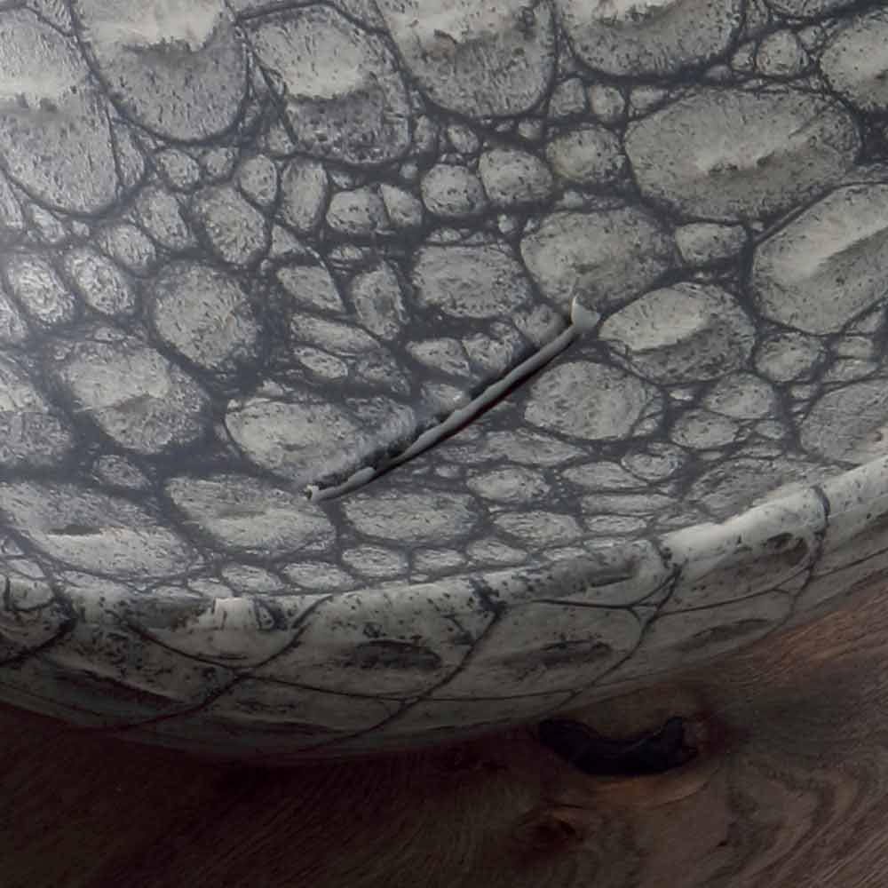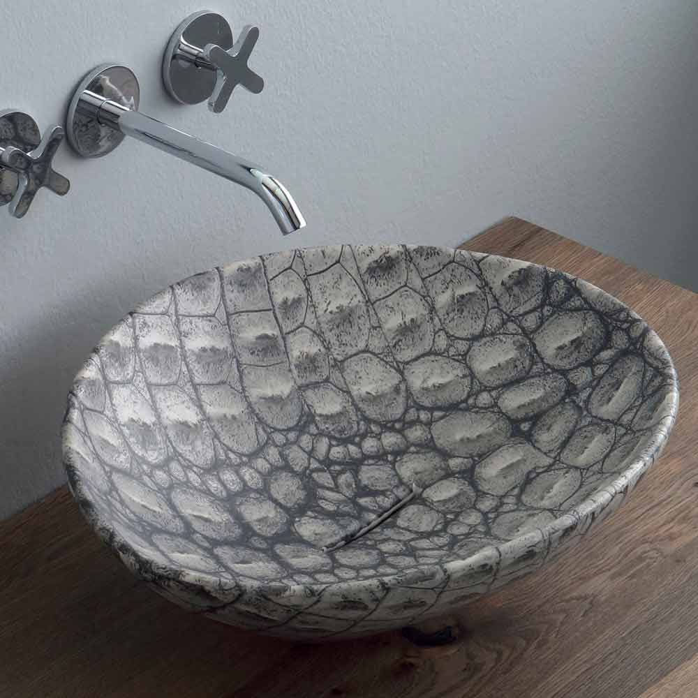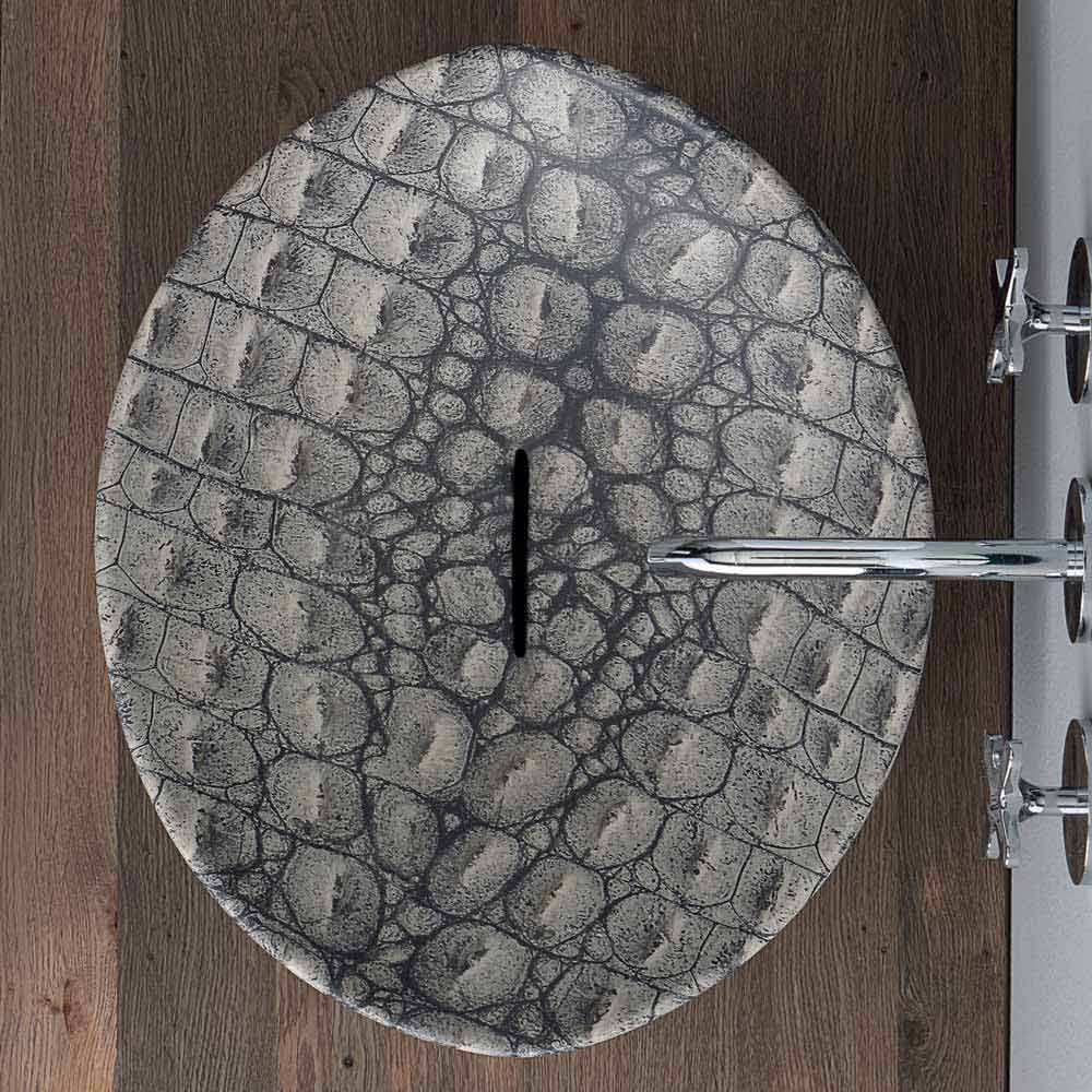 Aufsatzwaschbecken aus Keramik in Kokosnuss made in Italy Tiere Animals ist ein unregelmäßig geformtes Aufsatzwaschbecken aus Keramik mit durchgehendem Wasserablauf. Sein Finish erinnert an die Haut des Kaimans.