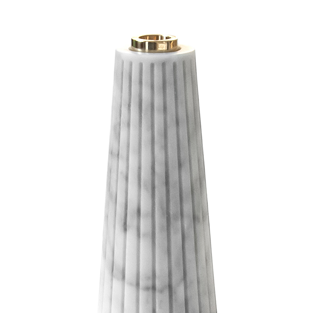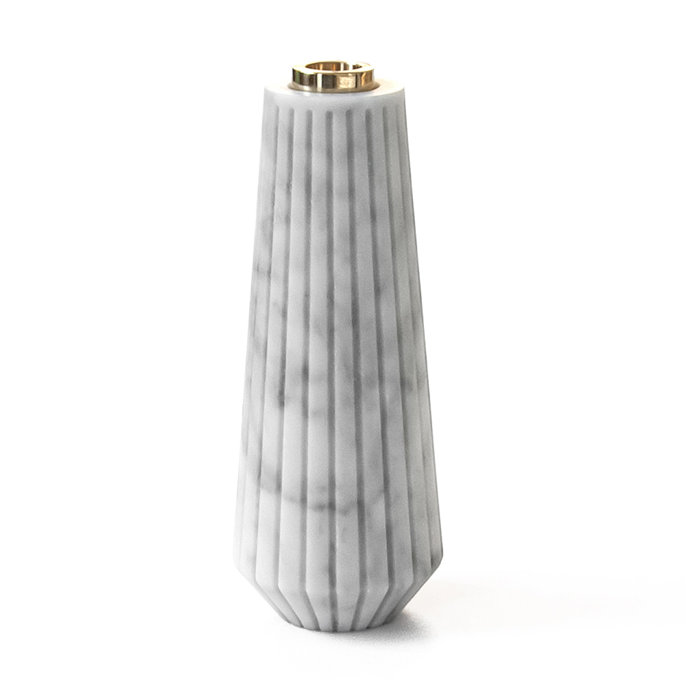 Kleiner gestreifter Kerzenhalter aus weißem Carrara-Marmor und Messing, hergestellt in Italien.