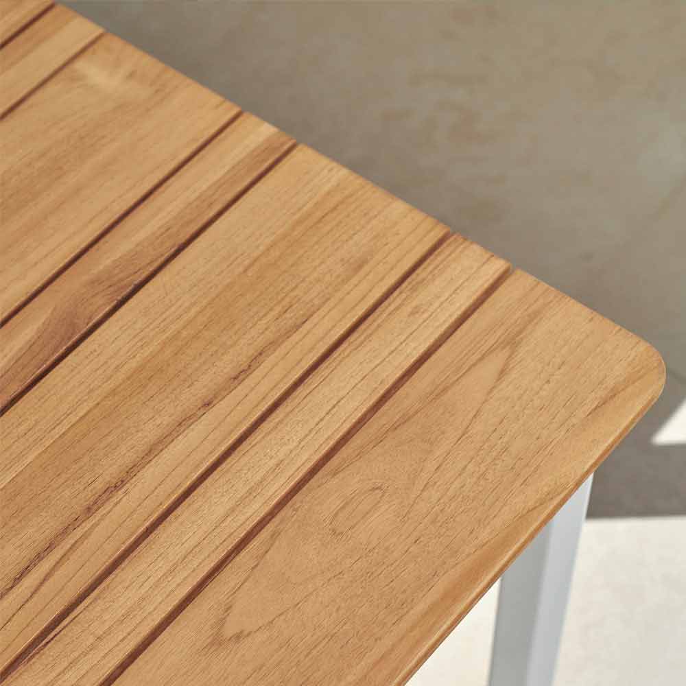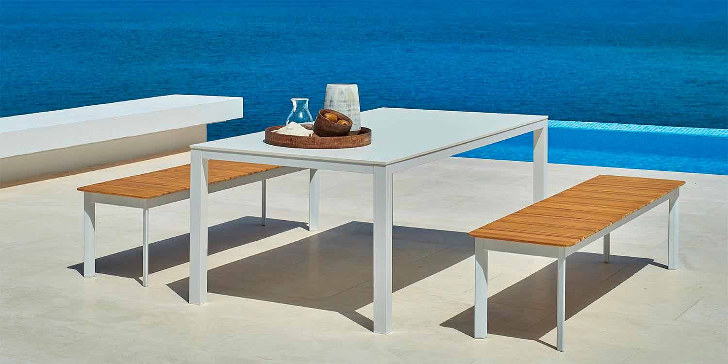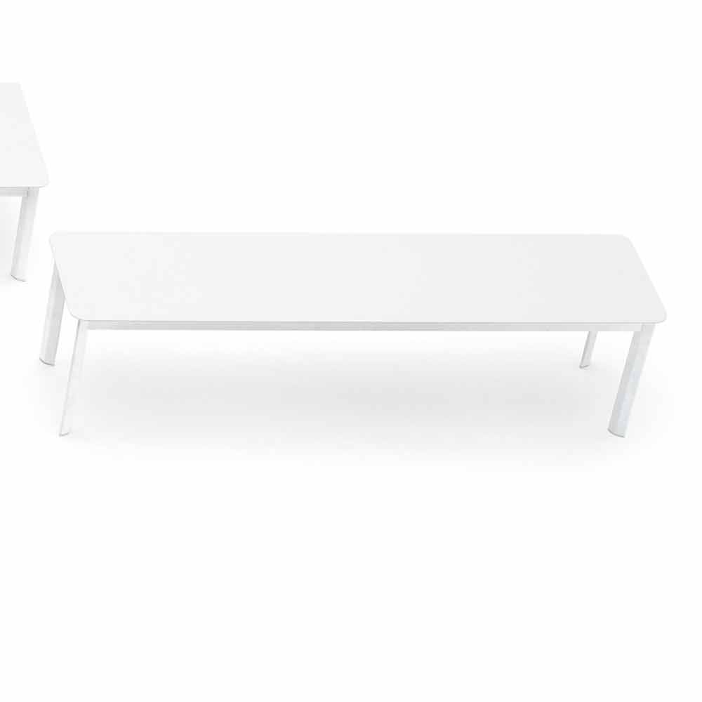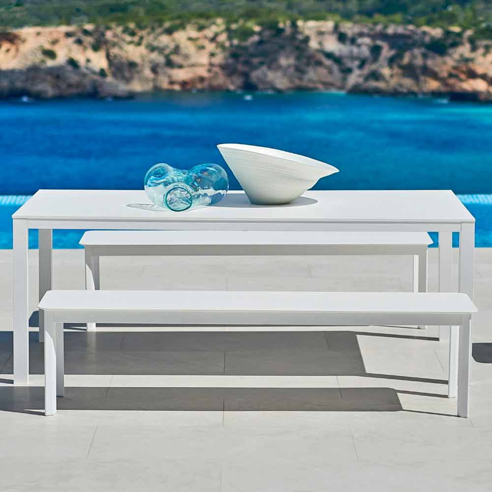 System ist eine fantastische Gartenbank mit einer pulverbeschichteten Aluminiumstruktur in weiss lackiert; mit einer Sitzfläche aus HPL (Dicke 1,2) finish: seidengrau - Tischkante schwarz, weiss - Tischkante schwarz, anthrazit - Tischkante schwarz, weiss - Tischkante weiss, Zementfarben - Tischkante braun, Bedonia Stein - Tischkante braun, Corten - Tischkante braun; oder mit einer Tischplatte aus Keramik gestockt (Dicke 1,2) finish: Kalkweiss und Porphyrgrau oder Teak (Dicke 1,7)  von zertifizierten Anpflanzung.