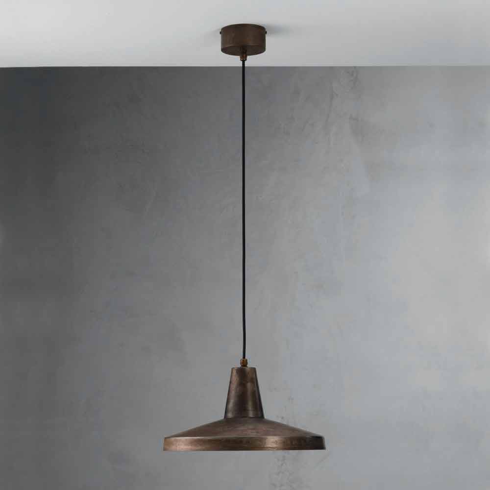 Monica ist eine wunderschön geformte Pendelleuchte in schmaler Glockenform und besticht durch sein ausgezeichneten industriellen Retro Stil. Monica verleiht einen rauen und vollkommenen naturbelassenen Anschein, der in jedem Winkel seine besonderen Eigenschaften perfekt in Szenierung bringt. Ihr minimlistischer Stil schafft verspielte Lichteffekte und lässt den Raum in seiner Wesentlichheit erstrahlen. Bei einer bestimmten Behandlungsmethode wird das Ausgangsmaterial mit Wasserstoffperoxid eingesprüht und bringt damit die Alterung in Schwung (Näheres siehe unten).