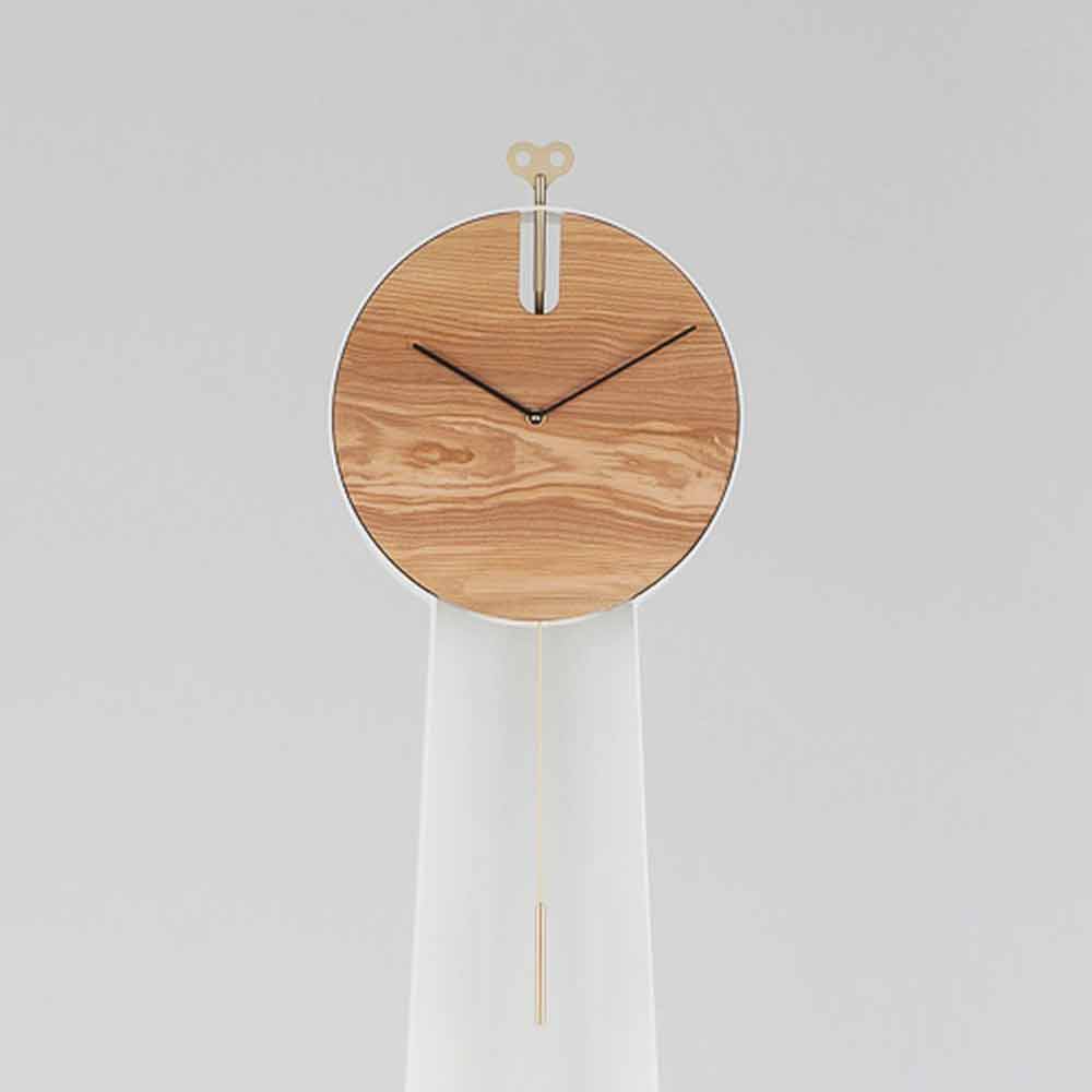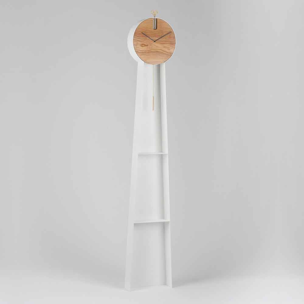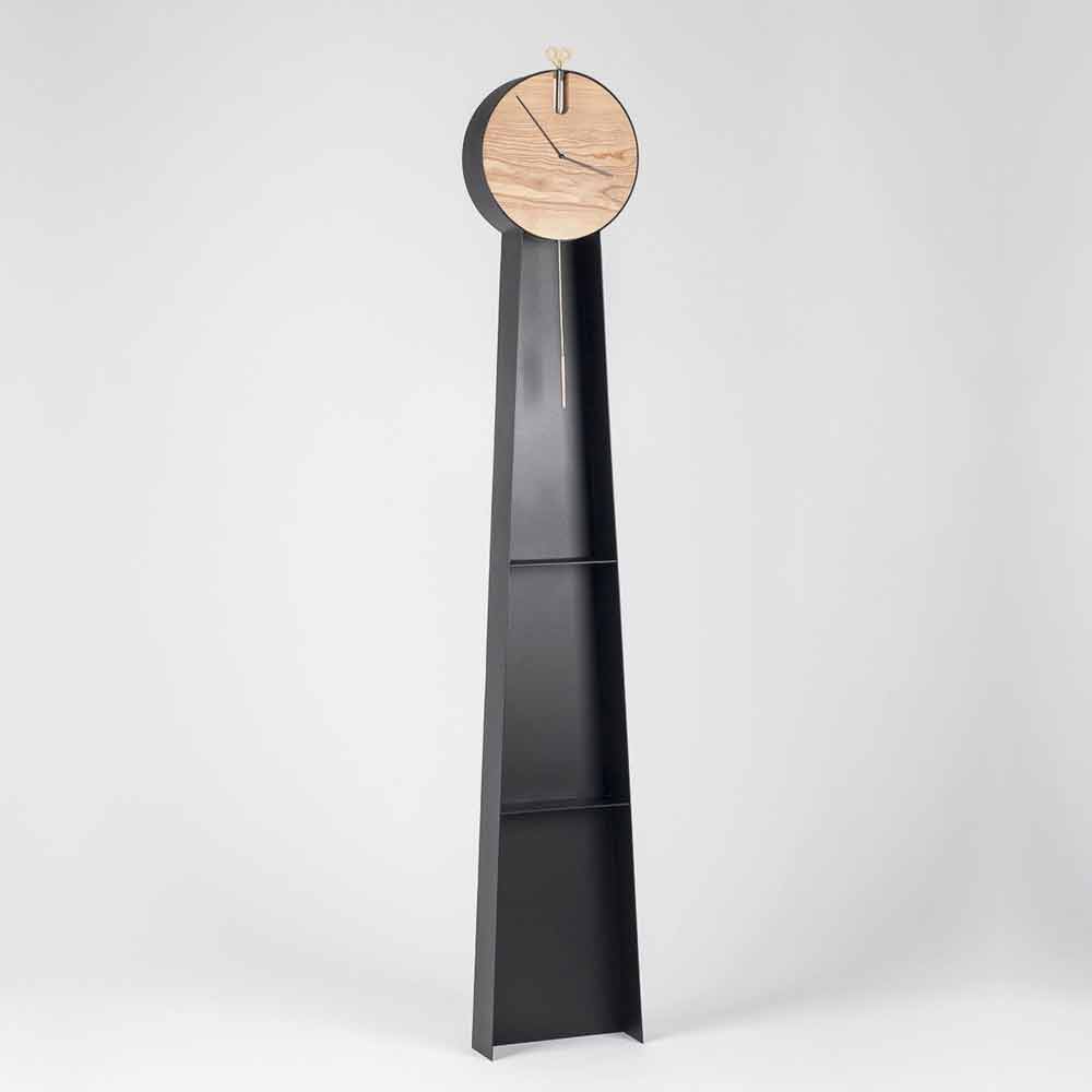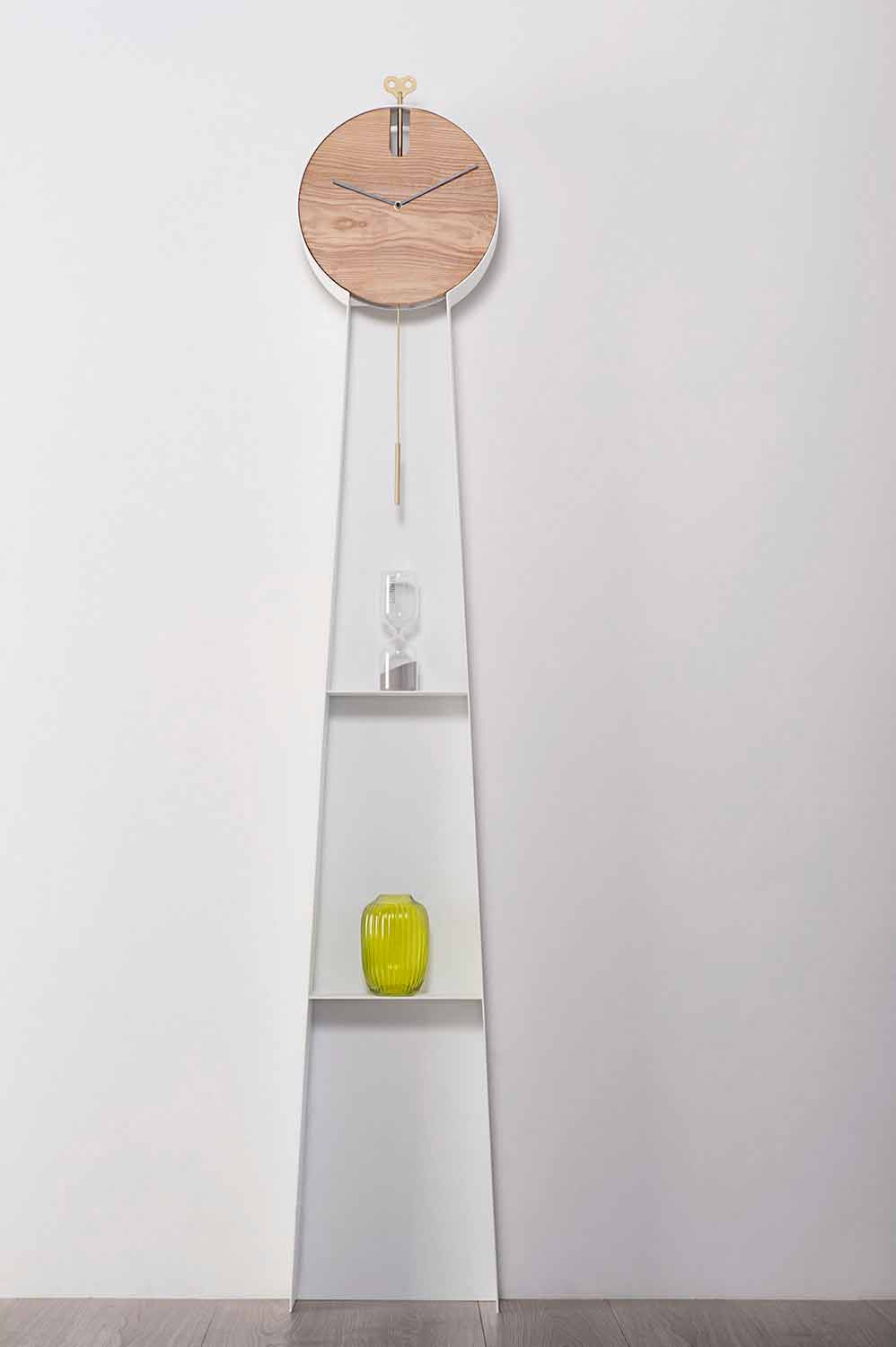 Diese Bodenpendeluhr ist ein innovatives Objekt, das ein innovatives und äußerst modernes Design mit einer klassischeren Note kombiniert, die der für alte Pendeluhren typische Aufzugsschlüssel aus Messing verleiht. Die Struktur ist vollständig in Italien aus RAL-lackiertem Stahlhandgefertigt und verfügt über zwei praktische Regale, in denen Möbelstücke platziert werden können, die dem Produkt noch mehr Persönlichkeit und Charakter verleihen. Die Uhr besteht stattdessen aus massivem Eschenholz, das zusammen mit Stahl eine raffinierte und moderne Ästhetik ergibt.