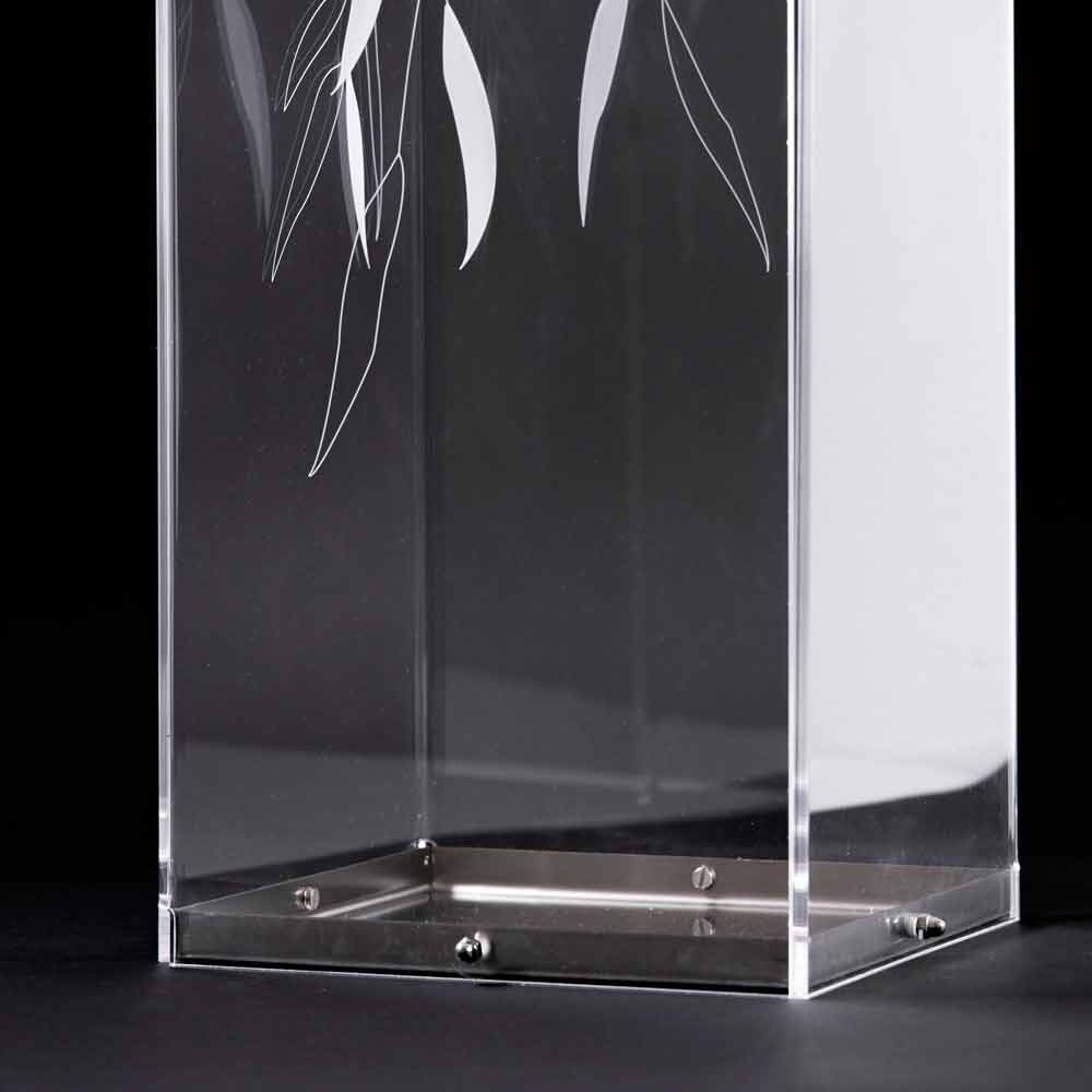 Der Schirmständer aus transparentem Plexiglas zeichnet sich durch die laserbeschrifteten Verzierungen von Blättern und Sockel aus Edelstahl aus.