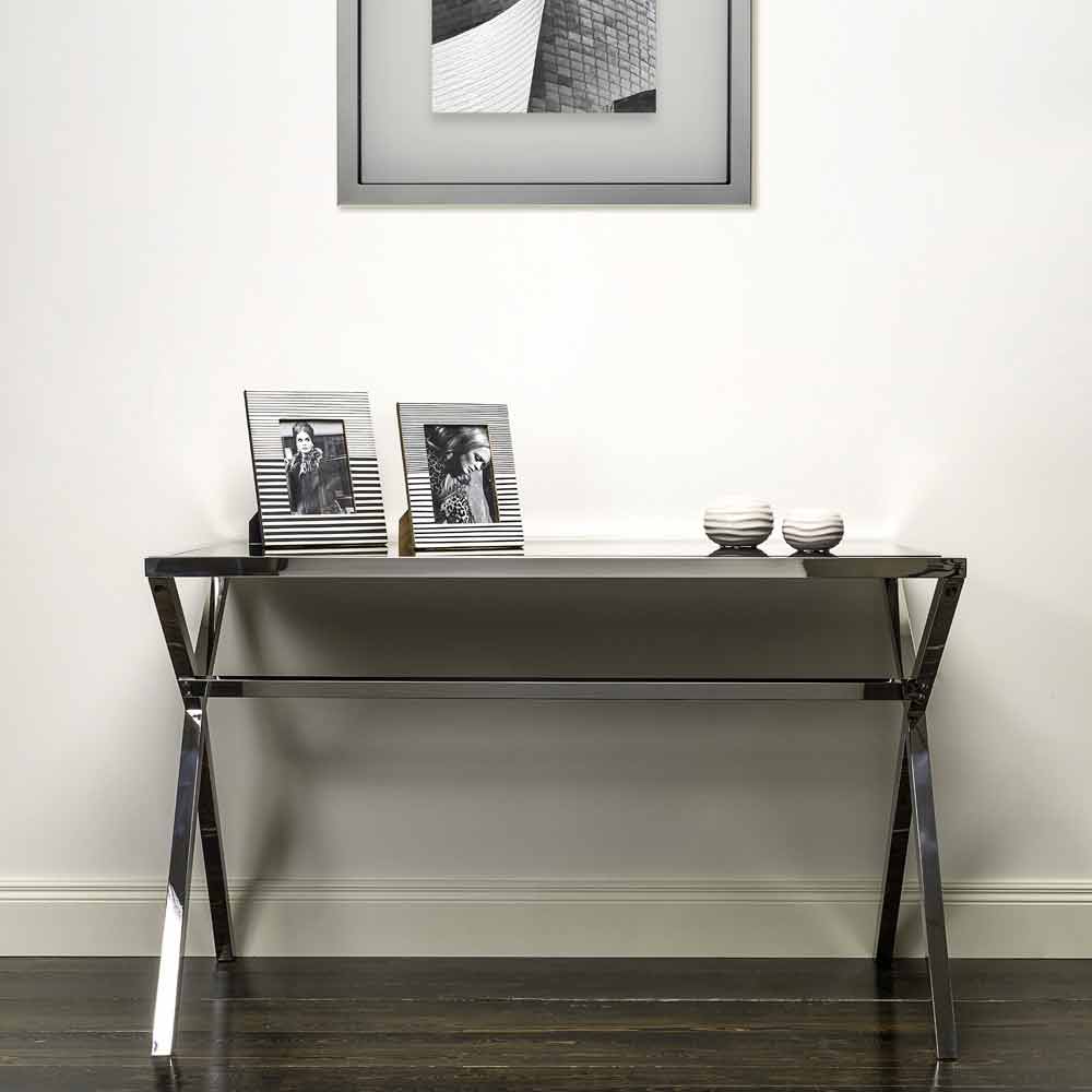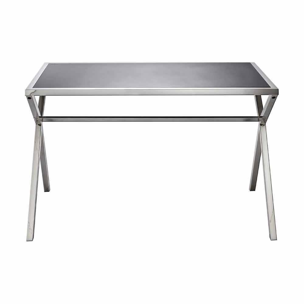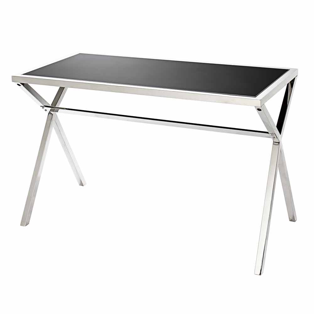 Design Schreibtisch aus Stahl und glänzend schwarzem Glas L120xH75cm Millon Millon ist ein Schreibtisch mit einfachen und modernen Linien. Die Struktur besteht aus Stahl, während die Oberseite aus glänzendem schwarzem Glas besteht. Dank seines vielseitigen Designs kann es im Wohnbereich oder im Büro installiert werden.