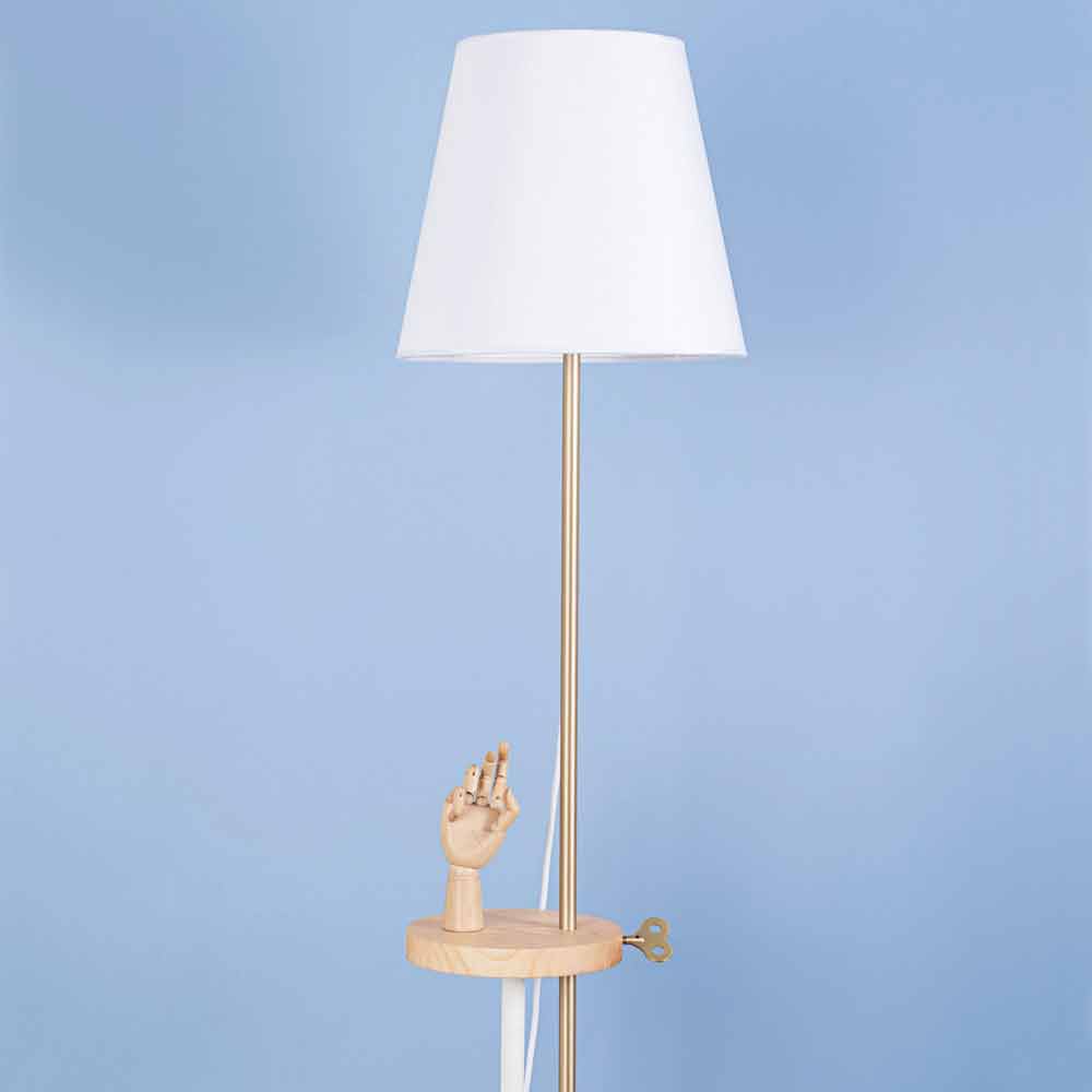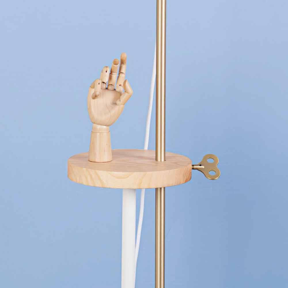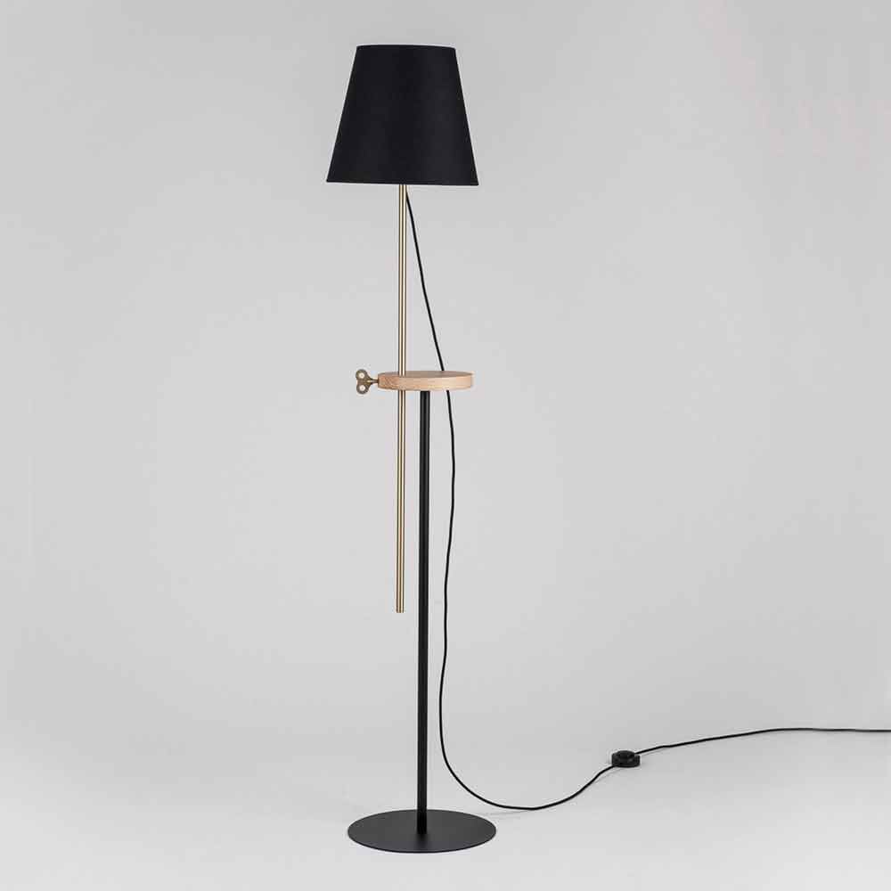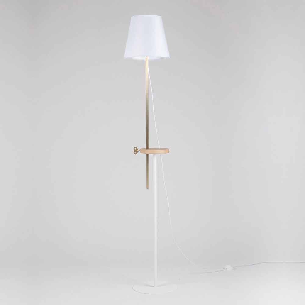 Diese Stehlampe wird vollständig in Italien hergestellt und stellt die perfekte Verschmelzung von Design und Funktionalität dar, ohne den dekorativen und visuellen Aspekt zu vernachlässigen. Der Sockel und der Lampenschirm bestehen aus RAL-lackiertem Stahl, während der mittlere Teil der Lampe über ein Regal aus Eschenholz verfügt, das als Auflagefläche, aber vor allem auch als grundlegendes technisches Element dient, um den Leuchtteil in verschiedene Höhen zu bringen. Mit dem schlüsselförmigen Einsatz aus Messing können Sie die Lampe in der von Ihnen bevorzugten Höhe befestigen und so die gesamte Umgebung oder einen kleineren Raum beleuchten. So können Sie beispielsweise bequem ein Buch auf dem Sofa lesen.