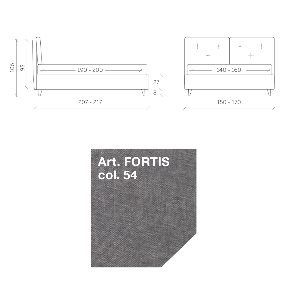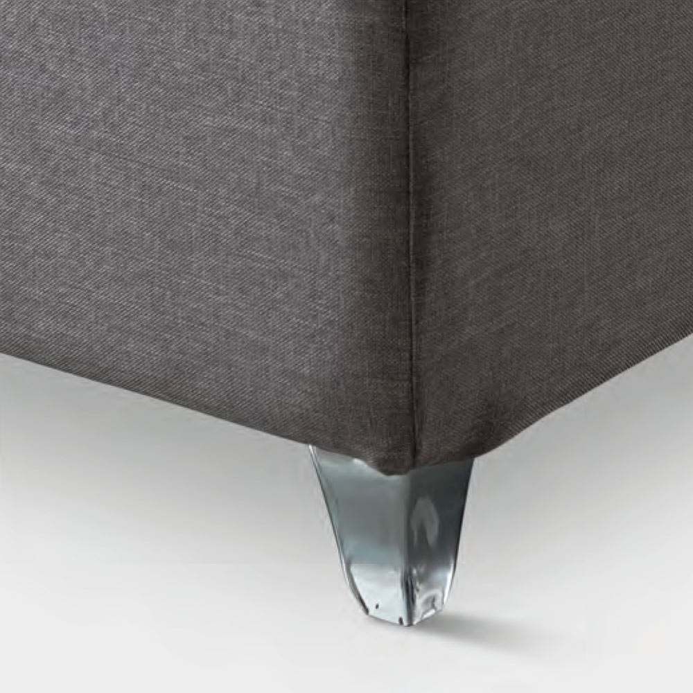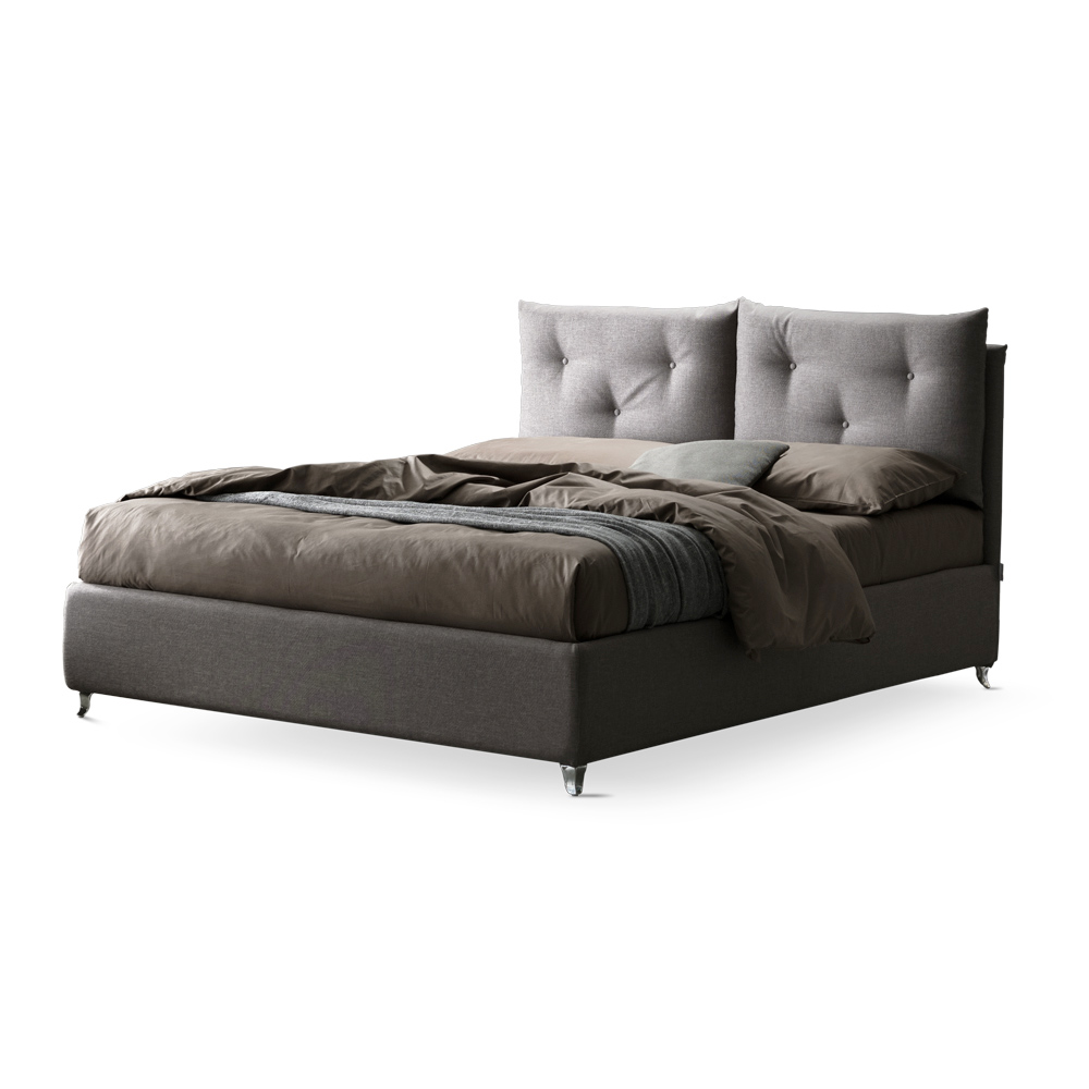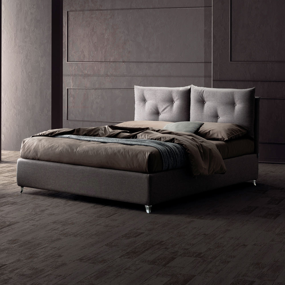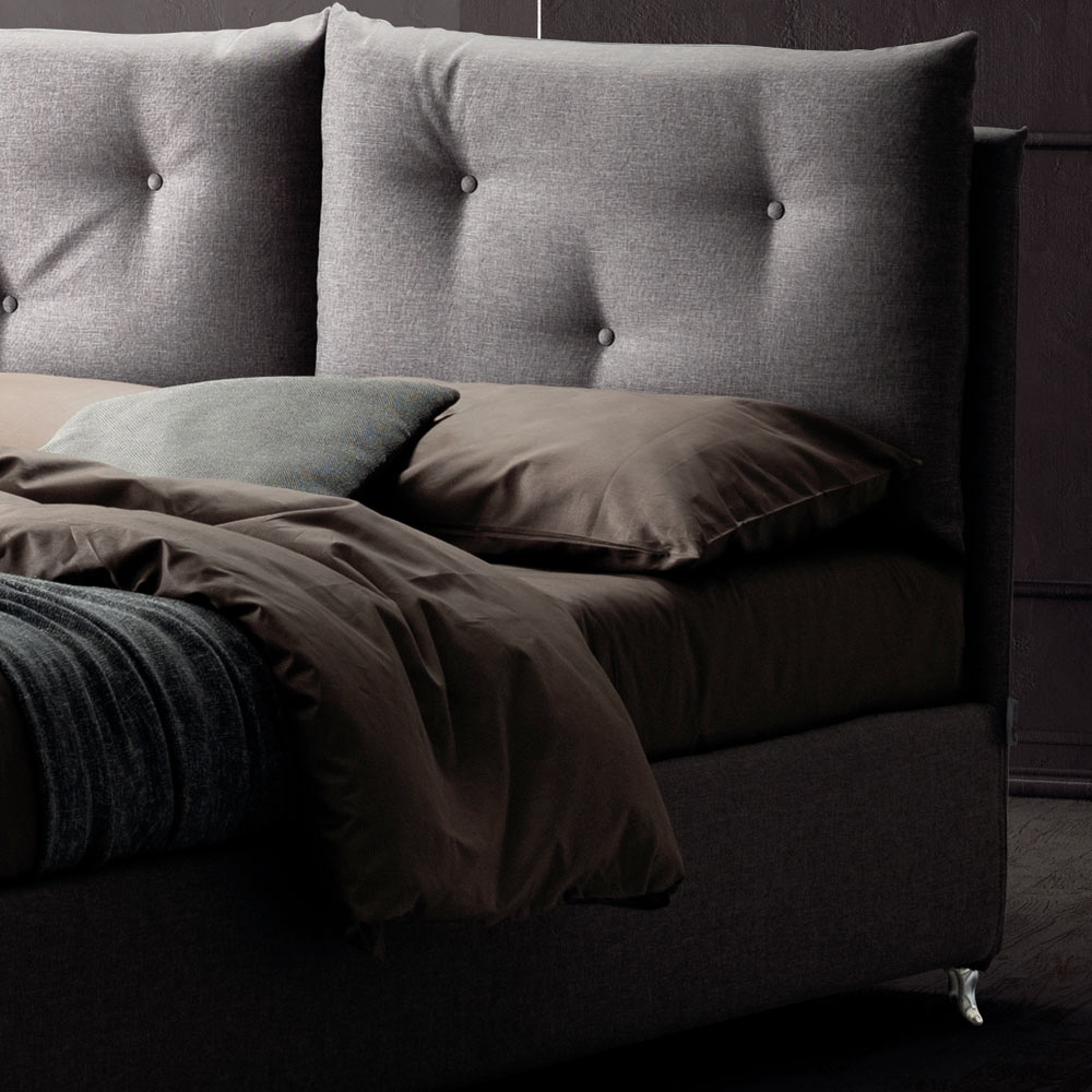 Doppelbett mit dynamischem Untergestell , Aufbewahrungsbox,Metallfüßen mit poliertem Stahlfinish (Höhe 8 cm) und Kopfteil aus wasserabweisendem und feuerfestem Stoff, gekennzeichnet durch die Einfügung dekorativer Knöpfe in den Kopfteilkissen. Die Kissen sind mit praktischen selbstklebenden Klettverschlüssen am Rahmen befestigt, die ein bequemes und einfaches Abnehmen ermöglichen. Dieses Bett ist der Inbegriff von Komfort und modernem Design. Es ist eine perfekte Kombination aus Raffinesse und Funktionalität und wurde entwickelt, um Nächte purer Entspannung und unvergleichlichen Stil zu bieten.
