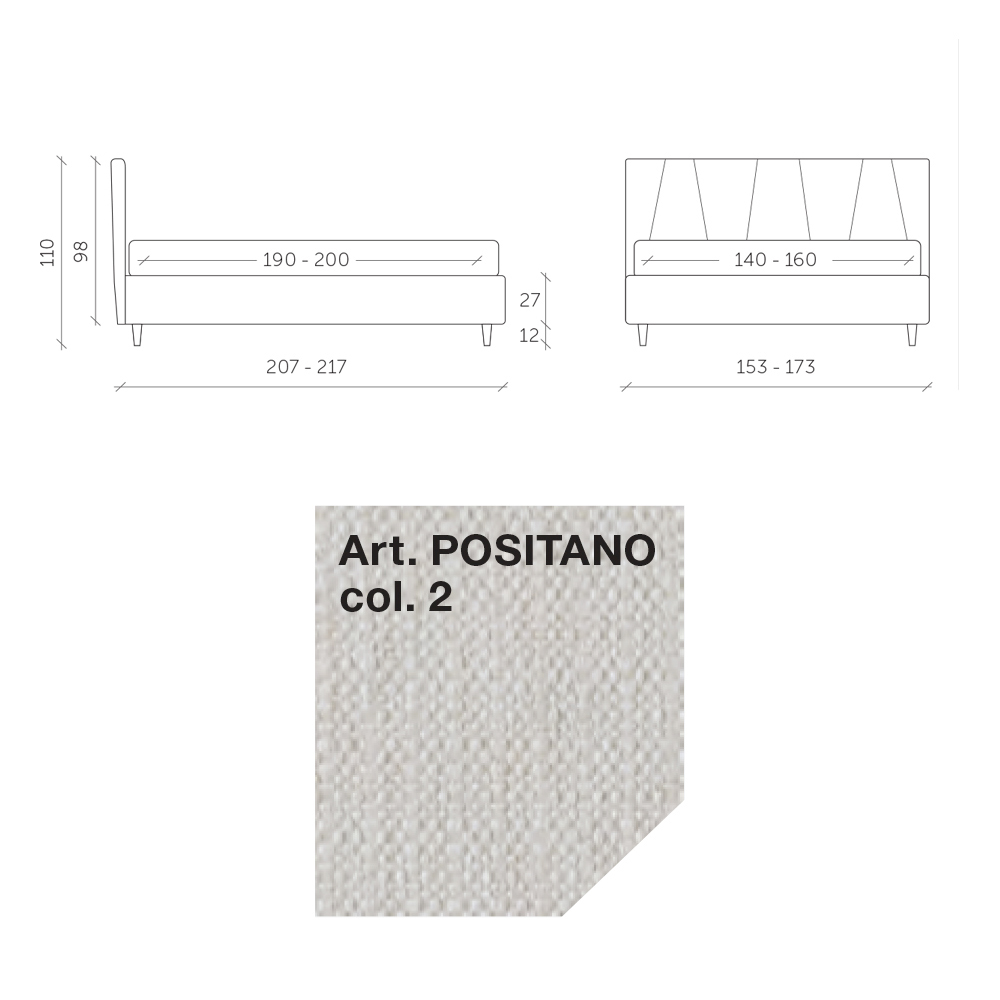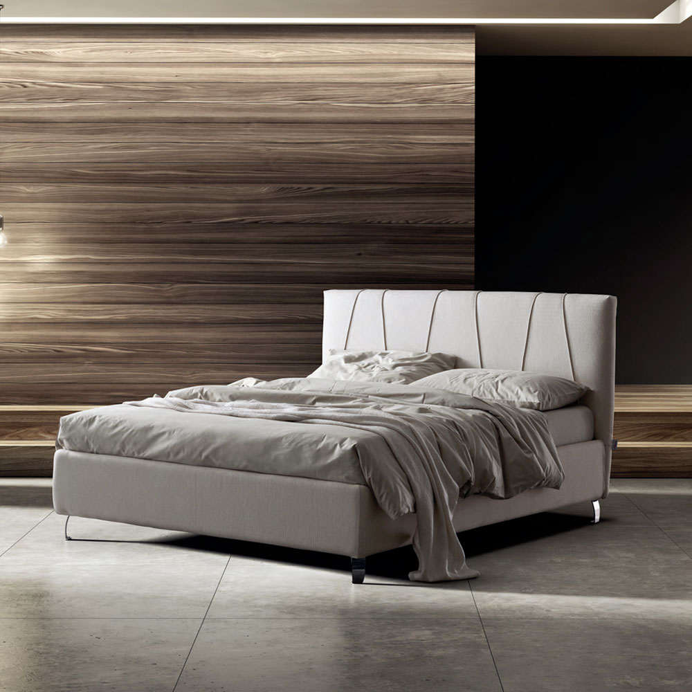 Doppelbett mit dynamischem Untergestell , Bettkasten,Metallfüßen in polierter Stahlausführung (Höhe 12 cm) und Kopfteil aus feuerfestem Stoff mit klaren Linien, gefertigt aus schrägen geriffelten Profilen, die ihm Charakter verleihen und ihm eine originelle ästhetische Wirkung verleihen. Dieses Bett ist der Inbegriff von Komfort und modernem Design. Es ist eine perfekte Kombination aus Raffinesse und Funktionalität und wurde entwickelt, um Nächte purer Entspannung und unvergleichlichen Stil zu bieten.