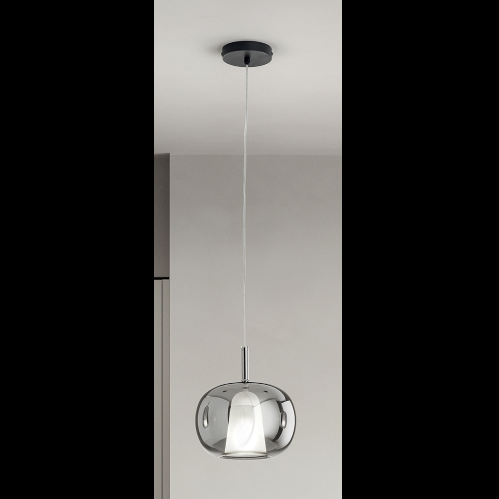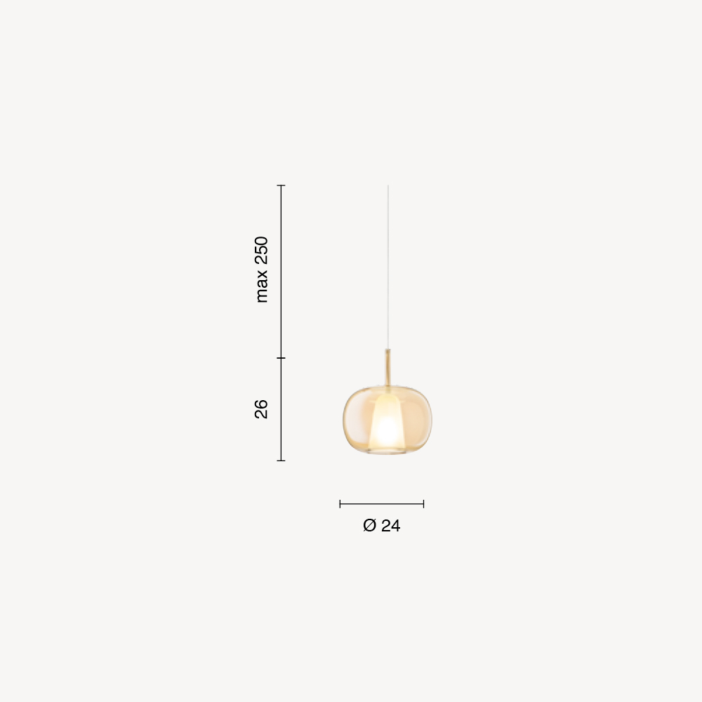 Lampe mit Metall -Deckensockel und Diffusor aus geblasenem Glas , gekennzeichnet durch eine Doppelschicht: innen aus satiniertem Glas und außen aus farbigem Glas . Kappe aus Polymermaterial zur Stabilisierung des Kabels in einer zentralen Position. Verstellbares Kabel.