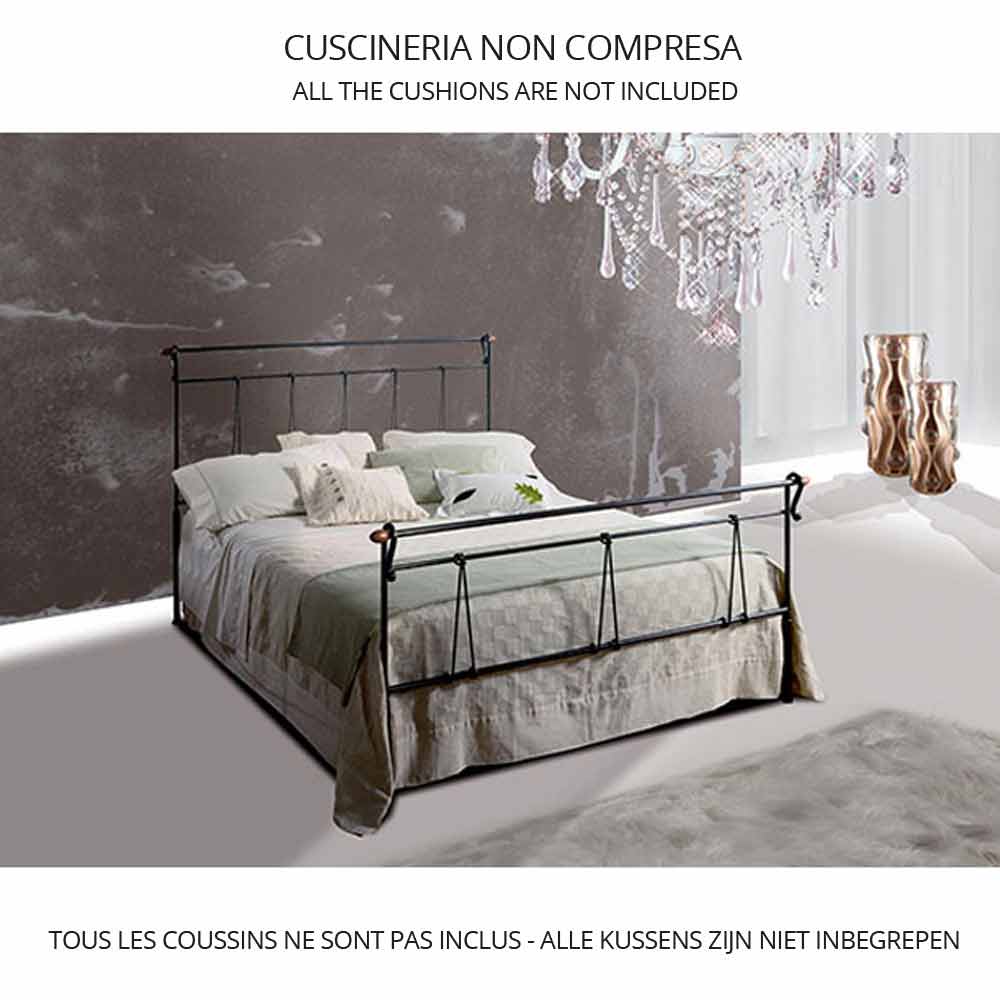 Das schmiedeeiserne Bett in der Variante DOPPELKOPFTEIL MIT BETTRAHMEN erfordert den Einsatz eines 160 x 190 großen Bettgestells, das auf dem Bettrahmen aufliegend angebracht werden muss. Falls besondere Anforderungen in Bezug auf die körperliche Konstitution, die Kombination mit vorhandenen Bettgestellen oder einfach nur aus ästhetischen Gründen bestehen, kann dieses Modell dank unserer handwerklichen Produktivität in Höhe, Länge und Breite verändert werden.