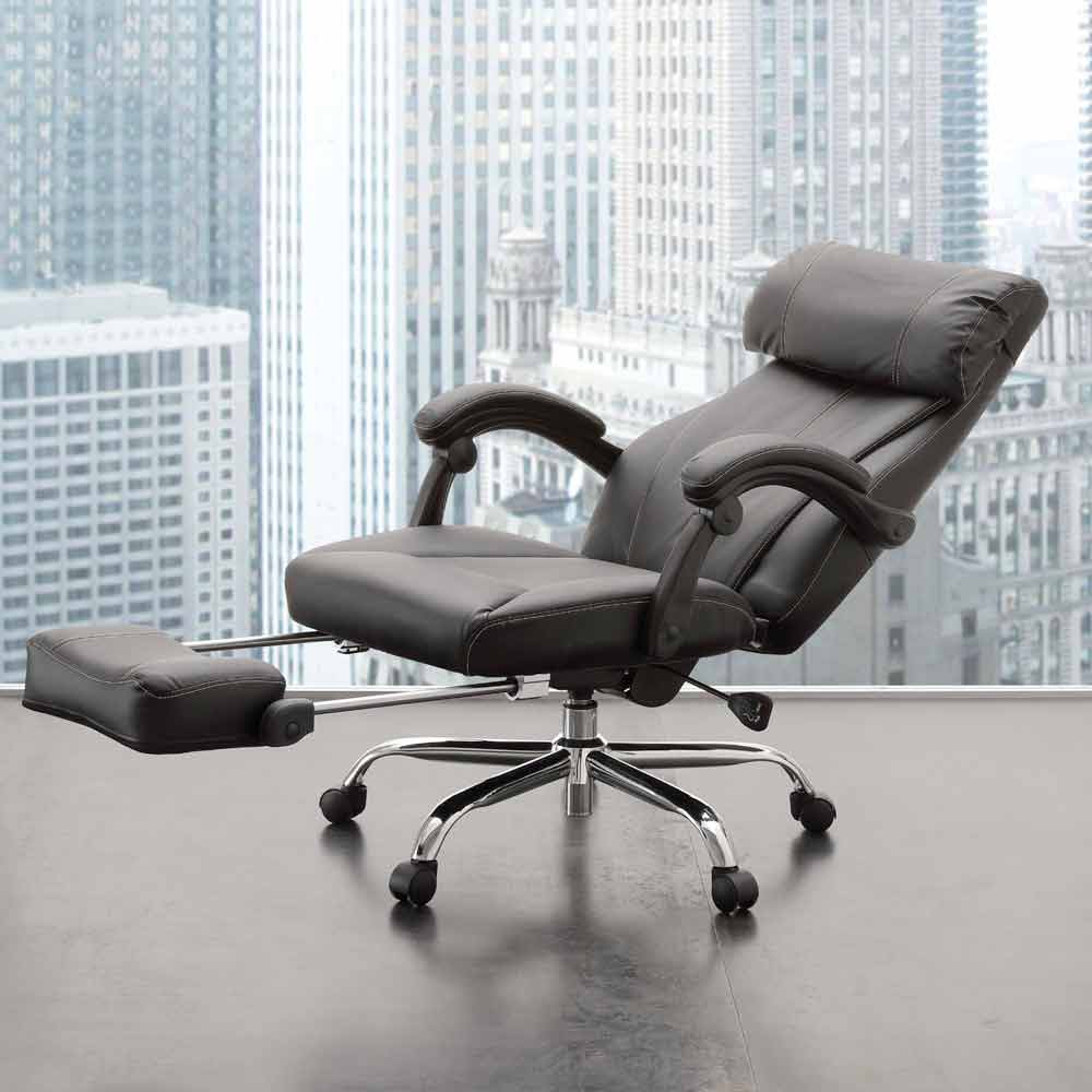 Die Nazzareno Bürosessel repräsentiert am besten alle diese Qualitäten; es kommt mit einem drehbaren Sitz mit Gaslift, einer Rückenlehne mit Kissen aus schwarzem Kunstleder, Sitzen und Fußstütze aus schwarzem Kunstleder; verchromter Metallrahmen mit Rädern.