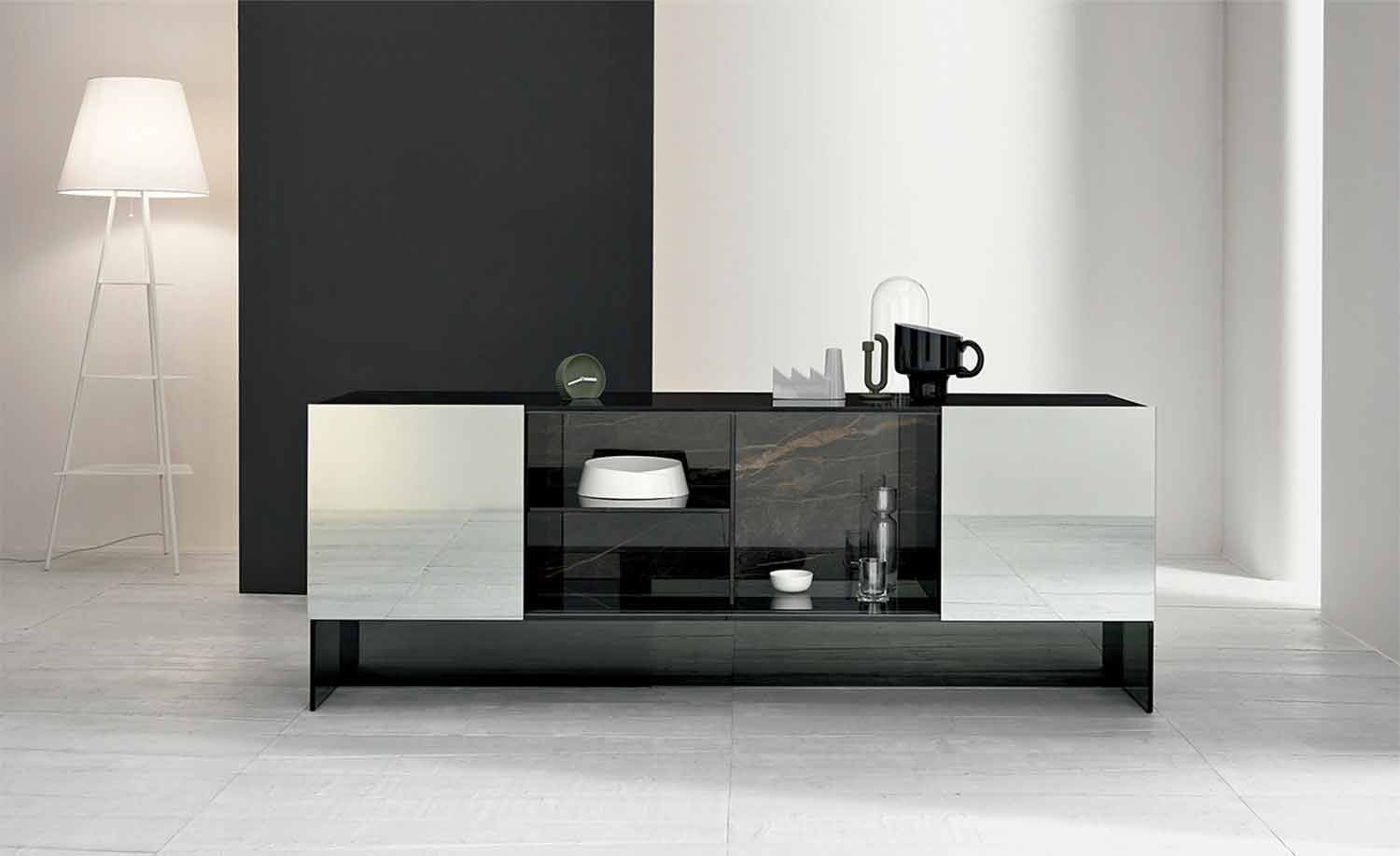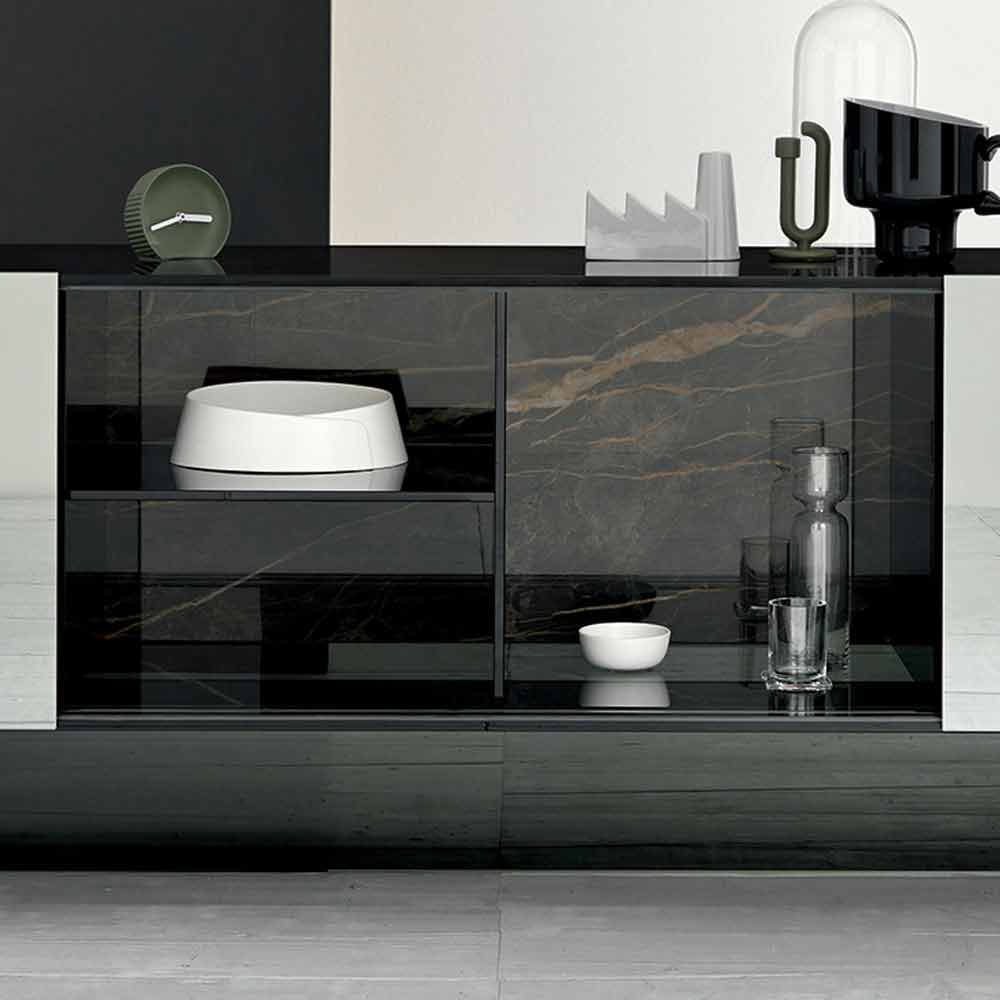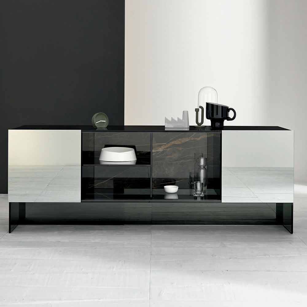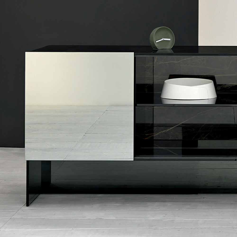Das Wohnzimmer Sideboard Scocca wird in Italien von Hand mit hochwertigen Materialien realisiert. Es besteht aus einer Struktur aus Rauchglas und zwei Schiebetüren aus Rauchglas und einer Rückenlehne aus glänzender Noir Desir-Keramik . Das Hauptmerkmal, das Scocca einzigartig macht, ist das Handschuhfach.