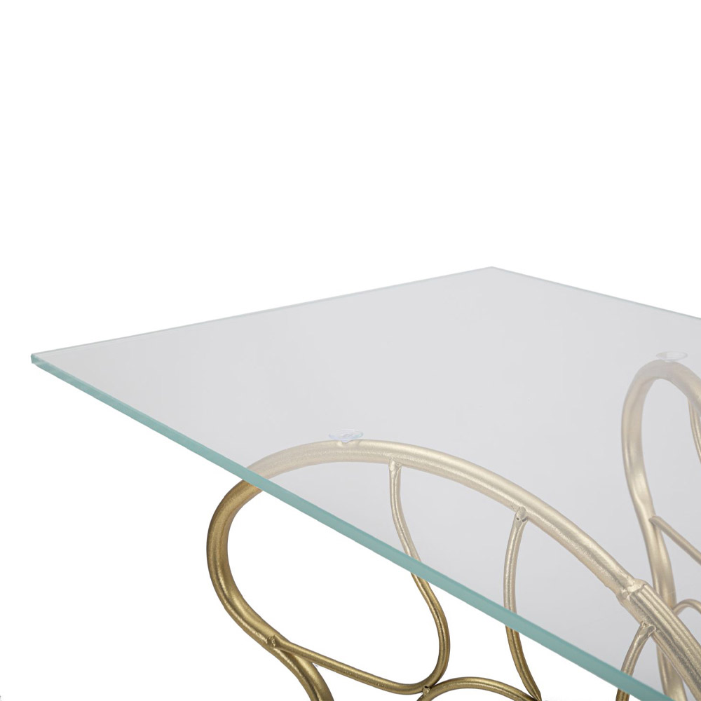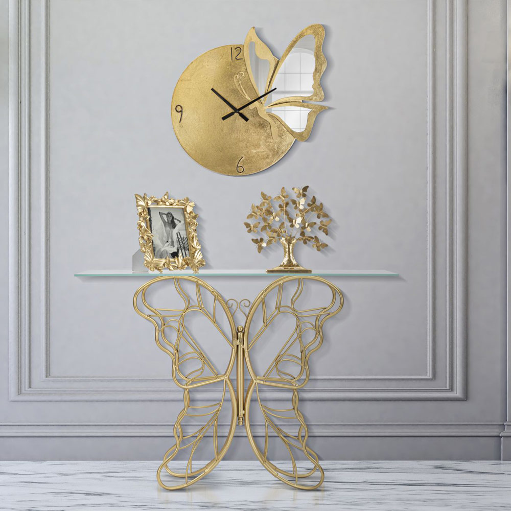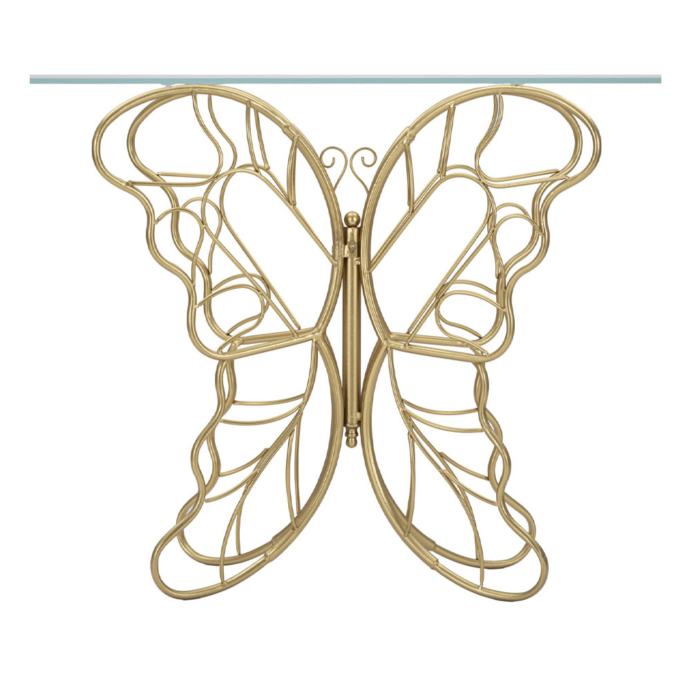 Moderne feste Konsole mit goldfarbener Eisenstruktur und transparenter Glasplatte . Ästhetik und Funktionalität vereinen sich zu einem originellen Einrichtungsaccessoiremit romantischer Seele, das sich durch die besondere Formgebung des Sockels auszeichnet, der die elegante Form eines Schmetterlings nachbildet und so das endgültige Design des Produkts bereichert. Die perfekte Kombination aus dem goldenen Finish des Sockels und dem raffinierten Touch der Glasplatte macht diese Konsole zu einem idealen Dekorationselement für alle, die einen kreativen Stil suchen und ihre Wohnräume gerne mit Objekten mit einer starken, raffinierten Persönlichkeit ausstatten.