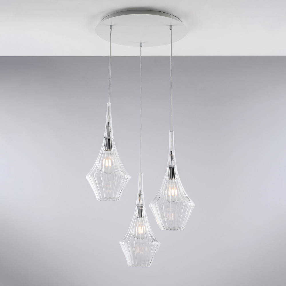 Diese elegante und leuchtende, handgefertigte Pendelleuchte aus Eisen mit Pyrex-Glas verleiht jedem Raum ein modernes und raffiniertes Ambiente. Die drei Pyrex-Glasdiffusoren mit ihren geometrischen und facettierten Formen streuen das Licht harmonisch und erzeugen so eine helle und zugleich elegante Lichtwirkung.