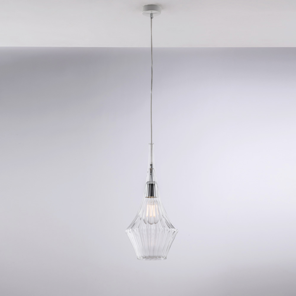 Diese schlichte und elegante, handgefertigte Pendelleuchte aus Eisen mit Pyrex-Glas ist eine moderne Beleuchtungslösung, die Räume mit Eleganz und Leichtigkeit erfüllt. Der einzelne Diffusor aus Pyrex-Glas mit seiner geometrischen, facettierten Form sorgt für eine gleichmäßige Lichtverteilung und schafft eine einladende und anspruchsvolle Atmosphäre.