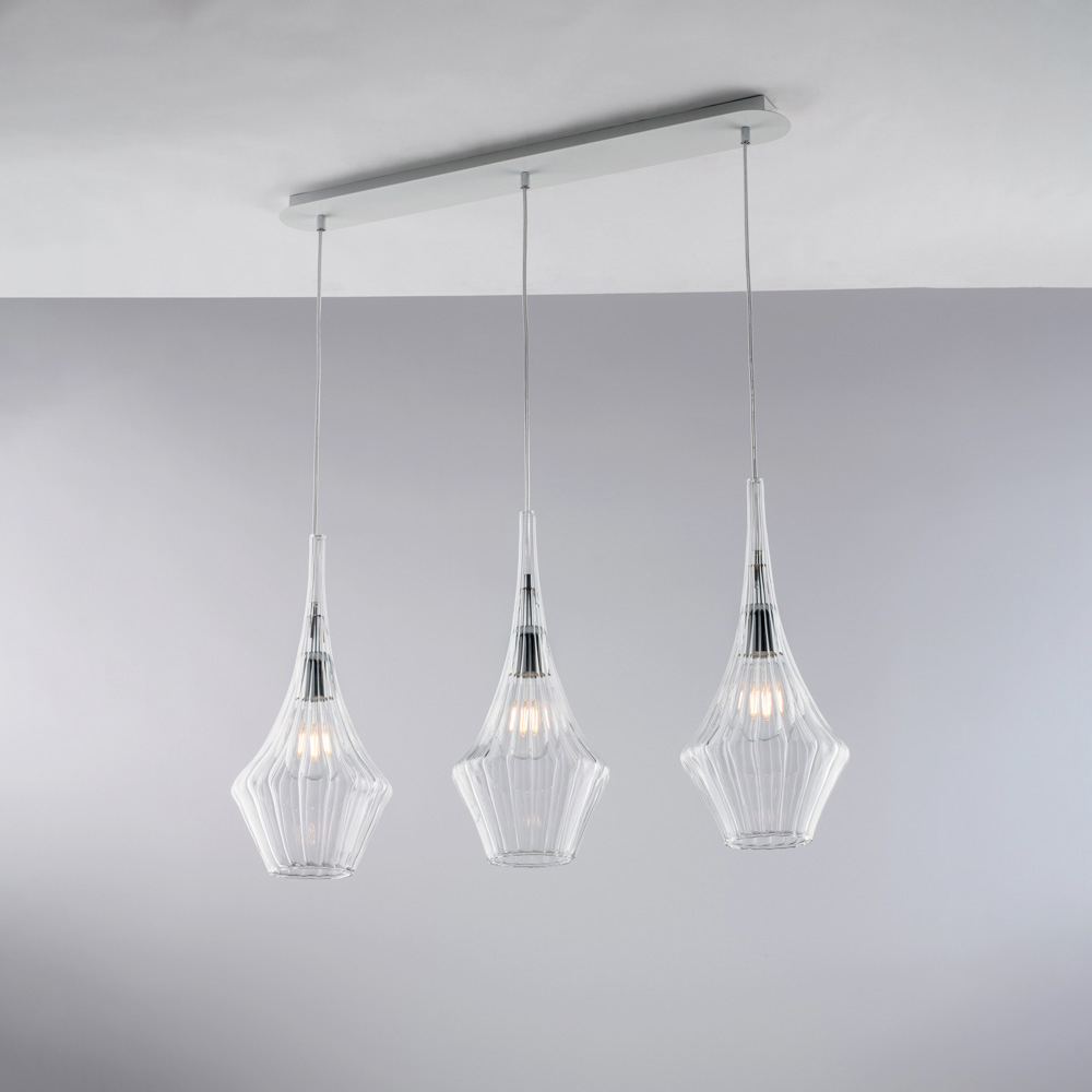 Diese handgefertigte Pendelleuchte aus Eisen mit Pyrex-Glas besticht durch ihr geradliniges und elegantes Design und ist eine moderne Beleuchtungslösung, die Räume harmonisch und stilvoll aufwertet. Die drei Pyrex-Glasdiffusoren mit ihren facettierten und harmonischen Formen verteilen das Licht gleichmäßig und schaffen so eine helle und elegante Atmosphäre.