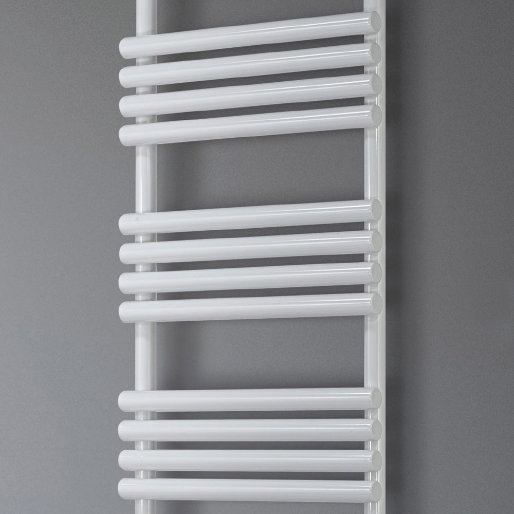 Elektrischer Handtuchwärmer aus Kohlenstoffstahl mit rein glänzender weißer Oberfläche, bestehend aus einer Reihe horizontaler Elemente mit einem Durchmesser von 3,5 cm, die an vertikale Verteiler mit einem Durchmesser von 3,5 cm geschweißt sind, vollständig in Italien hergestellt, inklusive Wandbefestigungsset . Elektrifizierungssatz unten rechts positioniert.
