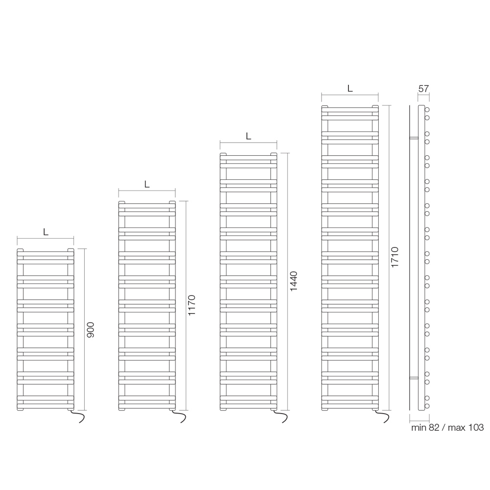 • Länge 60 cm – Tiefe 8,2 cm – Höhe 171 cm – Leistung 900 Watt