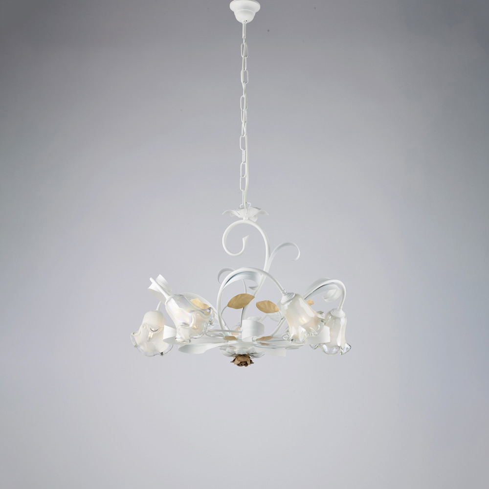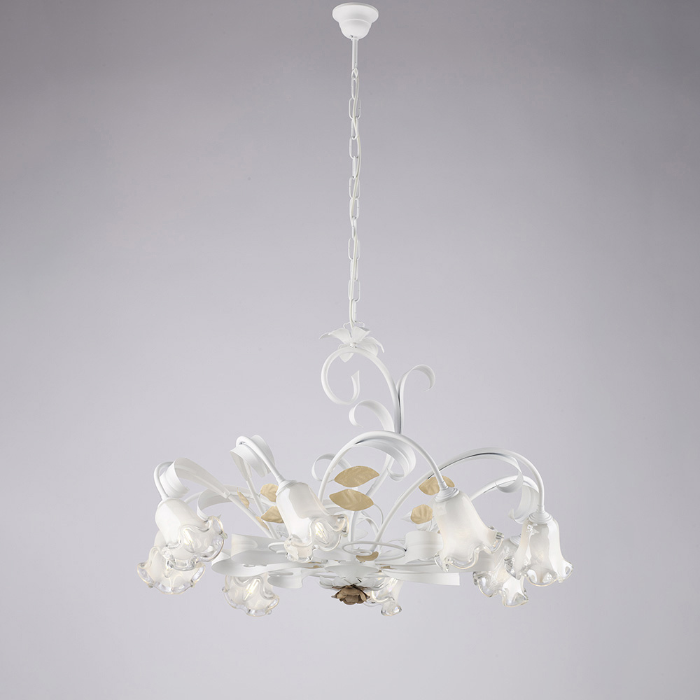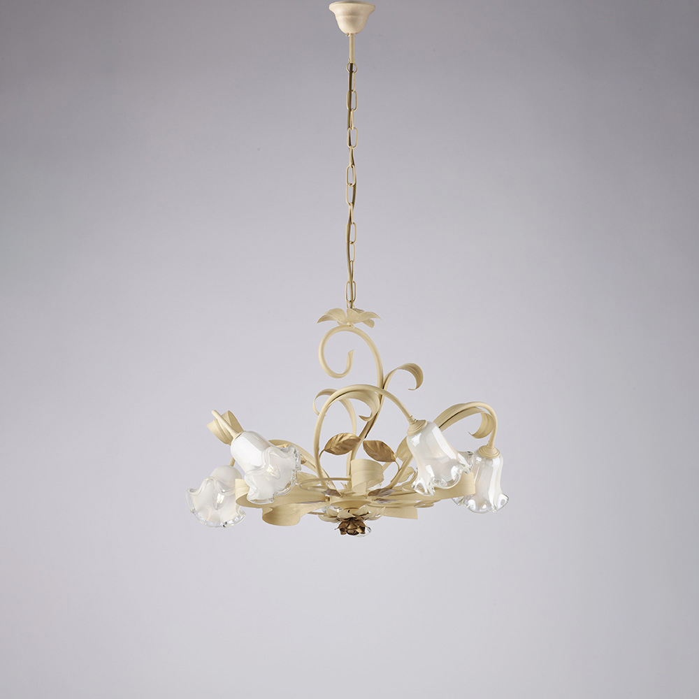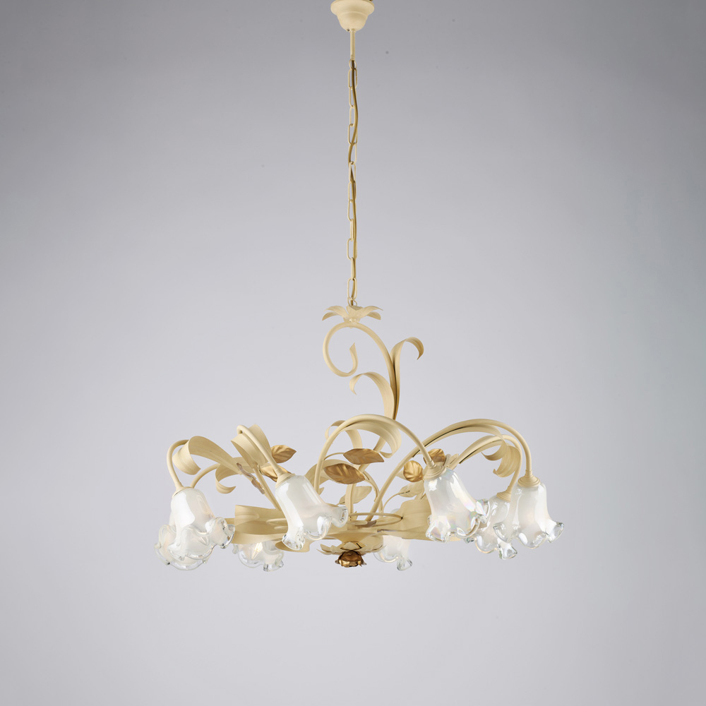 Romantisch und elegant zugleich: Dieser klassische Kronleuchter aus elfenbeinfarben lackiertem Eisen ist eine leuchtende Kreation, die den Charme italienischer Tradition auf raffinierte Weise neu interpretiert. Die geschwungene Form, verziert mit dekorativen Schnörkeln und einem blütenförmigen Glasschirm , verleiht dem Gesamtbild Leichtigkeit und Harmonie und schafft eine warme, einladende Atmosphäre.