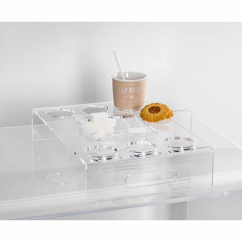Diese Kaffeetabletts mit Griffen bestehen zu 100% aus transparentem Plexiglas aus jungfräulichem Polymer und haben ein elegantes und raffiniertes Design , sehr widerstandsfähig.