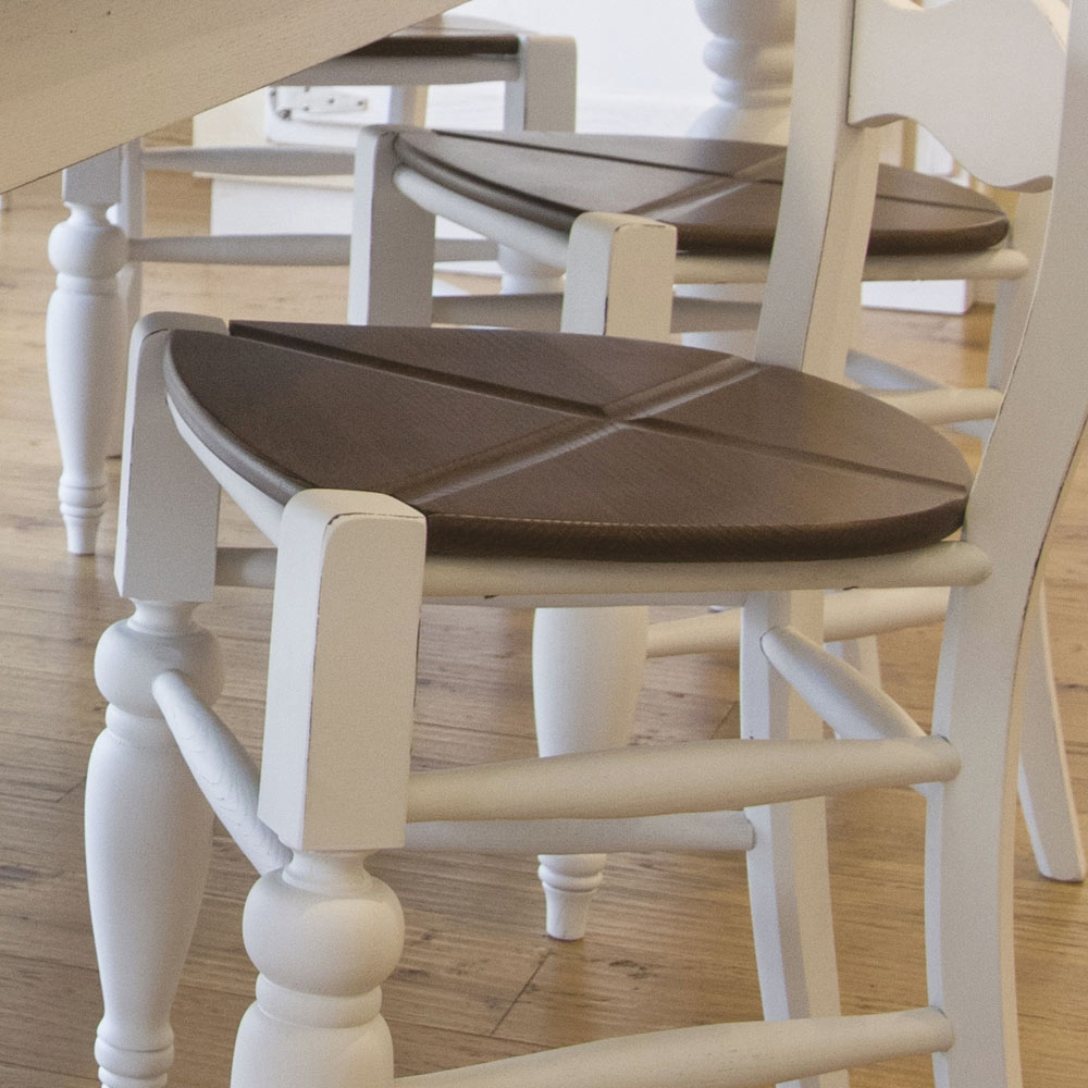 Ausziehbarer Indoor-Tisch aus gebürsteter Esche in Herdfarbe mit geformten Ecken . Die weißdornfarben lackierten Beine mit "abgenutztem Effekt" sind aus Massivholz gedrechselt und durch ein Massivholzband miteinander verbunden. Das Produkt wird vollständig in der Toskana unter Verwendung hochwertiger Materialien hergestellt und wird mit 2 Verlängerungen von jeweils 50 cm geliefert, die es vielseitig machen.