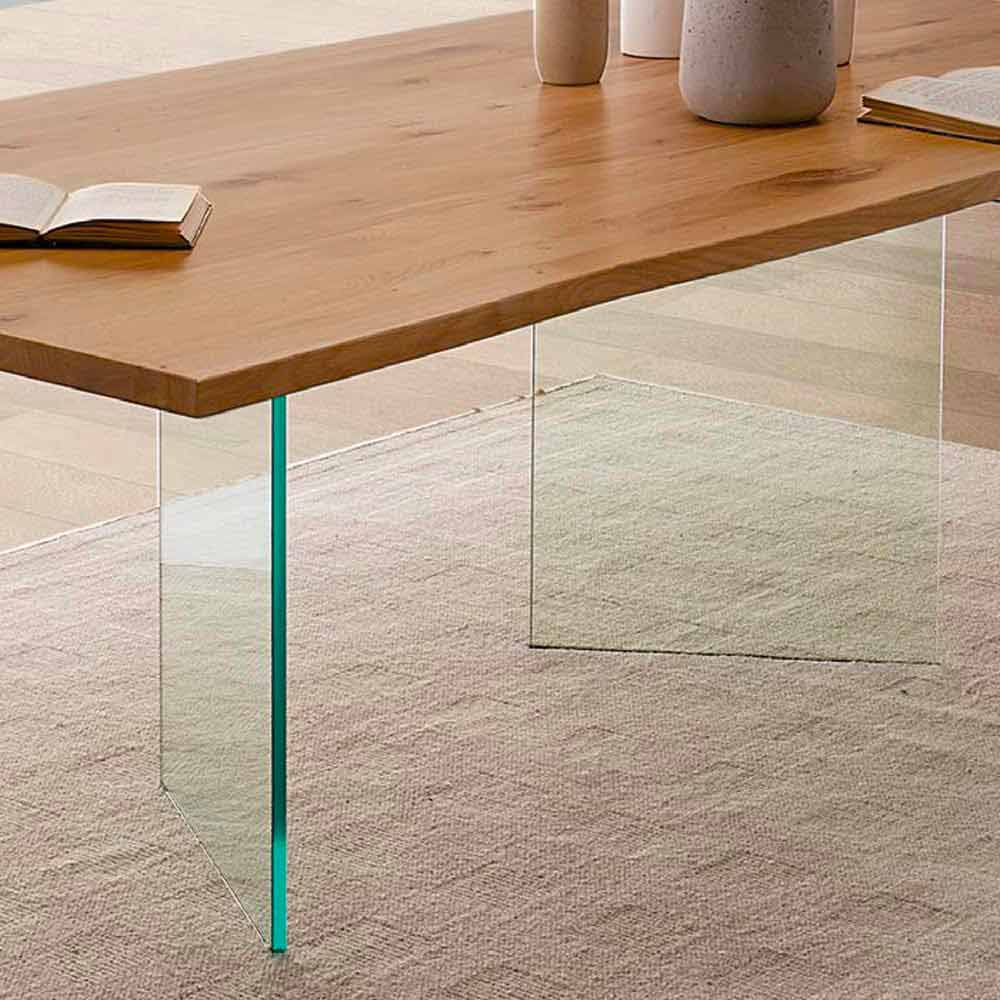 Dieser Esstisch zeichnet sich durch ein elegantes und funktionalesDesign aus , das es perfekt macht, Räume in Umgebungen mit einem zeitgemäßen und raffinierten Stil zu füllen. Die Besonderheit des Tisches sind zweifellos die beiden Beine, die den Eindruck erwecken, dass die Platte fast aufgehängt ist, da sie aus 1,5 cm dickem transparentem gehärtetem Glas bestehen, daher dünn, aber extrem solide und robust sind und das Gewicht der Eichenholzplatte tragen können. rustikal geknotet . Das in Italien hergestellte Produkt ist äußerst vielseitig und dank der Kombination von Materialien und Oberflächen in der Lage, den Raum mit Persönlichkeit zu füllen und das Zentrum der Aufmerksamkeit zu erobern.