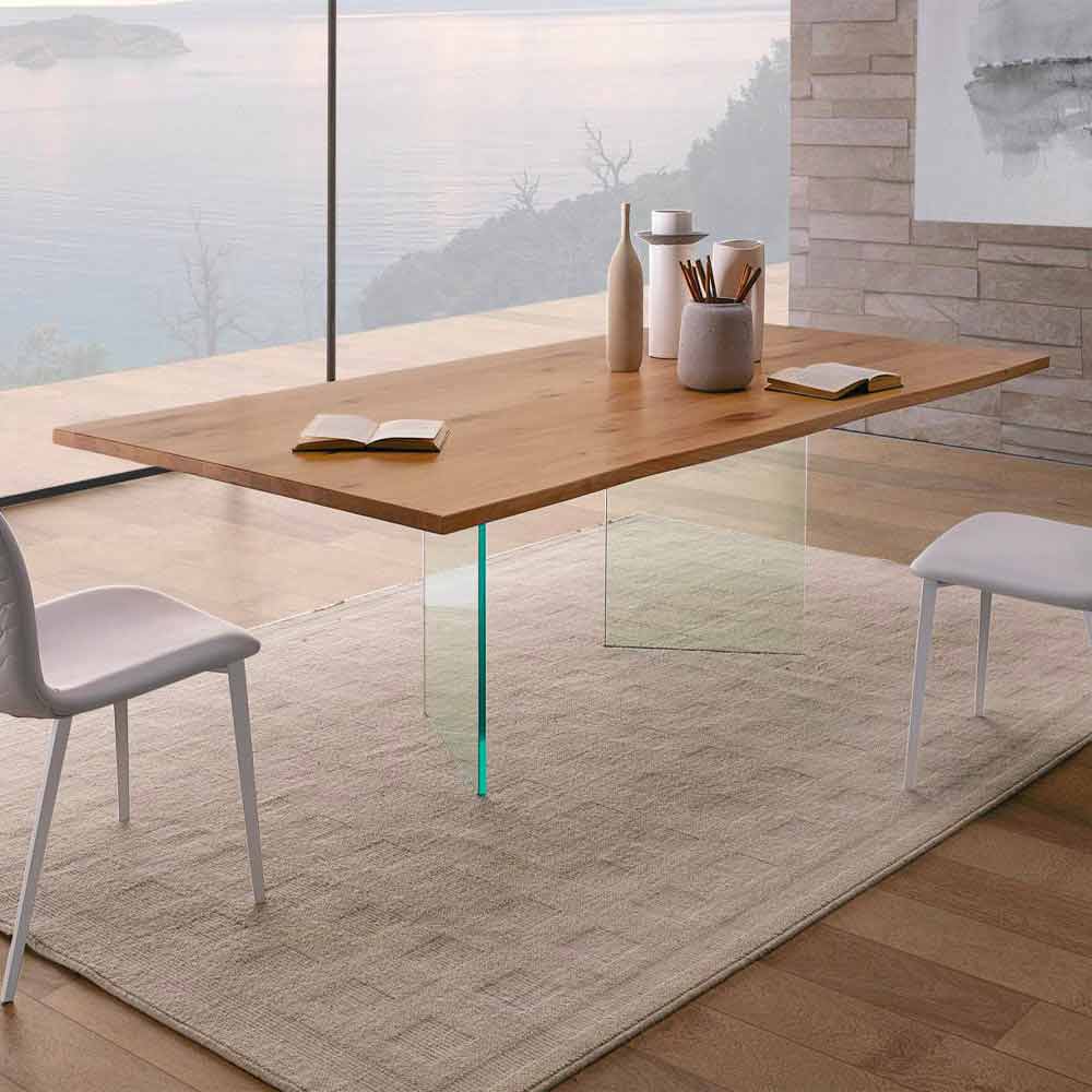 Moderner Esstisch aus Glas und Holz, hochwertiges Produkt Made in Italy.