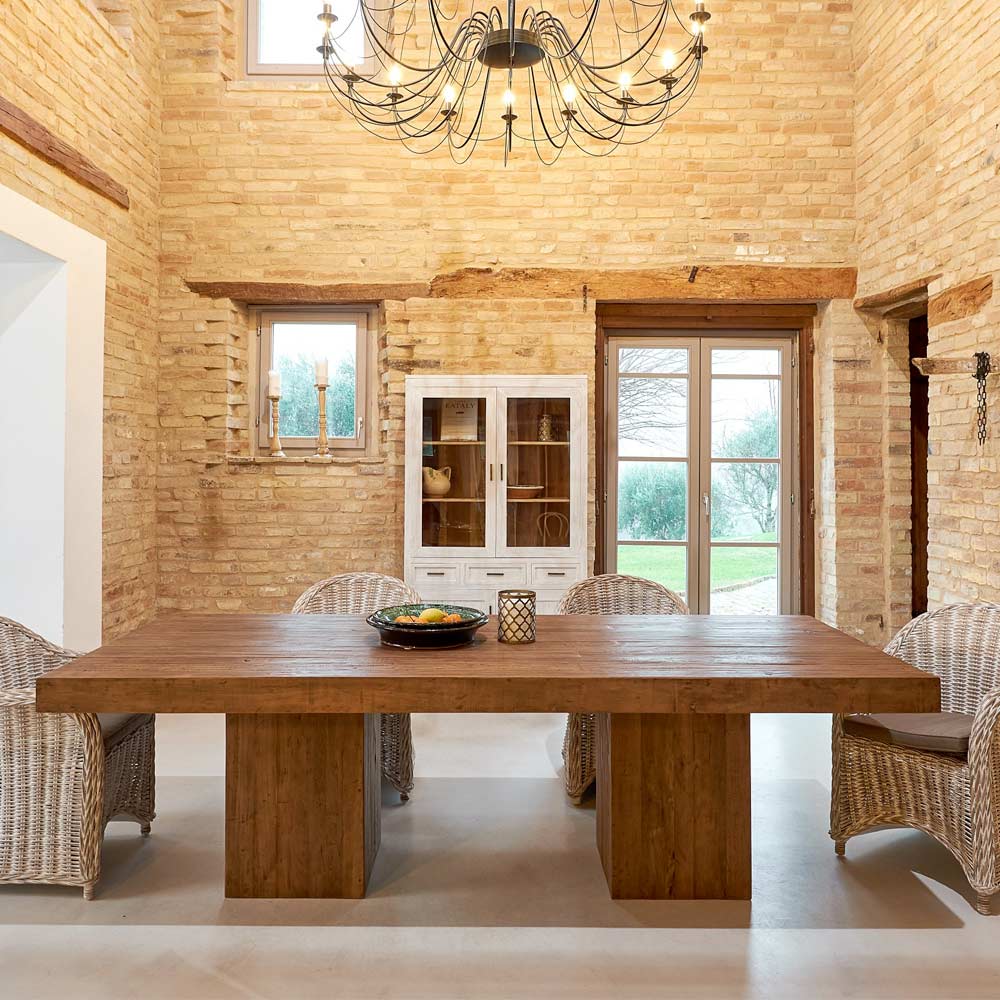 Esstisch gefertigtaus recyceltem Holz in natürlicher Kaffeefarbe mit doppeltem Sockel . Dieses Einrichtungsset ist im wahrsten Sinne des Wortes einzigartig , gerade weil es die besondere Geschichte der belebten Materie verkörpert. Die Verarbeitung erfolgt größtenteils nach handwerklichen Verfahren . Jeder Kratzer und jede Unvollkommenheit, jede Narbe im Holz zeugt von der Ursprünglichkeit einer Vergangenheit, die zu neuem Leben erwacht. Das legal aus alten Artefakten, Booten und verlassenen Gebäuden recycelte Tropenholz wird geschickt verarbeitet , um Würde und Glanz wiederzugewinnen. Dieses Produkt vereint die Essenz des rustikalen Geschmacks mit den Formen des zeitgenössischen Designs und mit einigen Details des Industriestils .