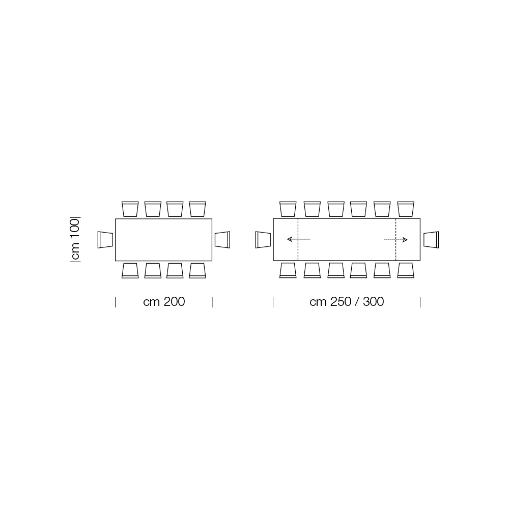 L 200 (300) x T 100 x H 76,5 cm. 14-Sitzer, erweiterbar mit zwei 50 cm langen Außenverlängerungen.