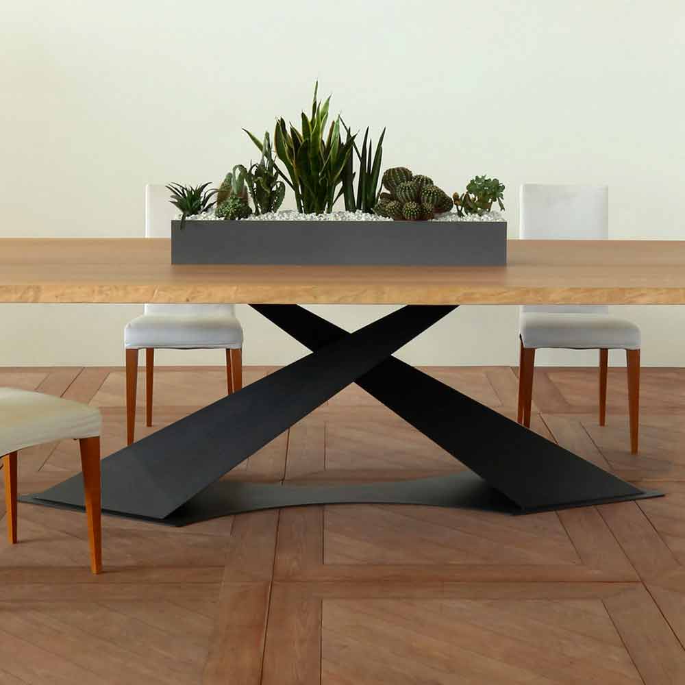 Der Tisch Elliot zeichnet sich durch eine gebürstete Decke aus massiver Eiche mit Rindenkante aus, die mit einem natürlichen Effekt und kratzfestem Wasserlack gestrichen ist. Dadurch wird eine außergewöhnliche Tischwirkung erzielt, ohne dass das Massivholz und der Träger Verformungen und Risse aufweisen Zentralmetall, mit asymmetrisch geneigten und gekreuzten Elementen.