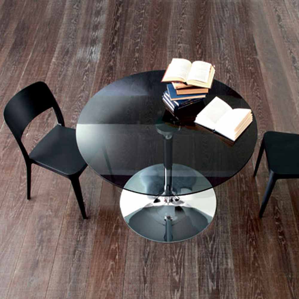 Esstisch made in Italy mit runder Glasplatte (10 mm dick) und zentralem Säulenfuß aus verchromtem Metall .