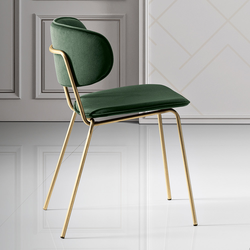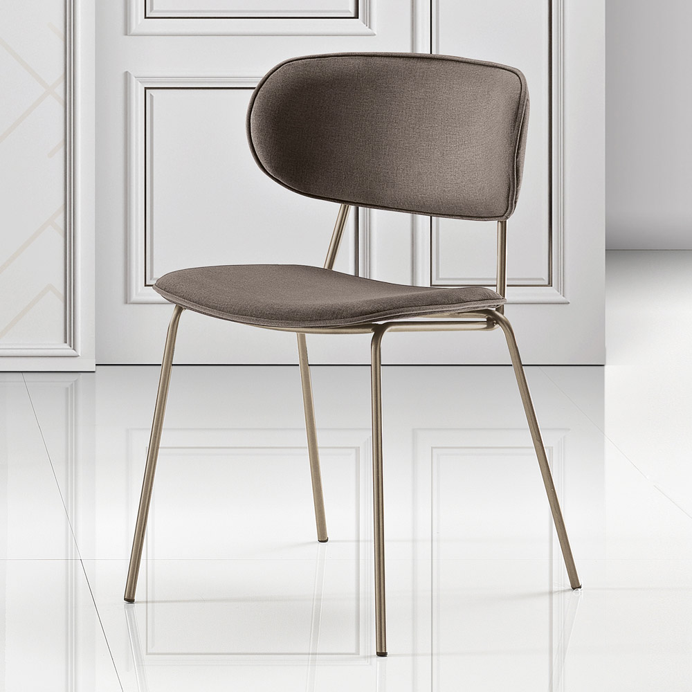 Dieser Stuhl ist ein Designjuwel, perfekt für alle, die Funktionalität und Stil kombinieren möchten. Der Sitz und die geschwungene Rückenlehne sind mit Stoff bezogen und bieten ein komfortables und stilvolles Sitzerlebnis. Die schlichte und doch raffinierte Silhouette des Stuhls wird durch die Metallbeine betont, die einen Hauch moderner Wärme und ein Gefühl optischer Leichtigkeit verleihen.