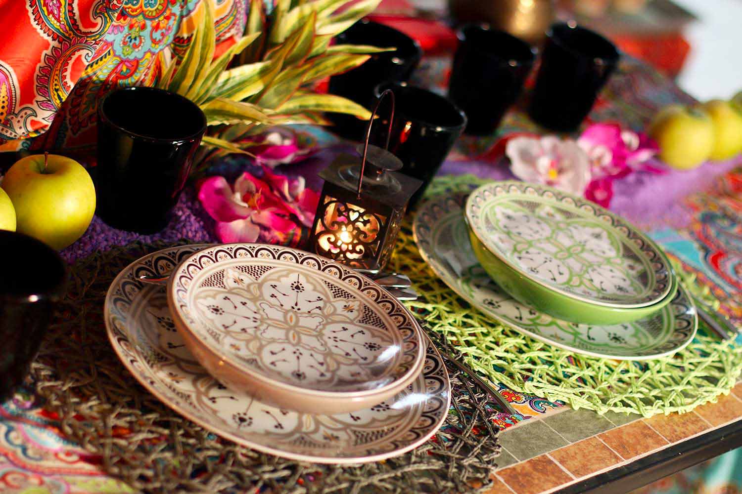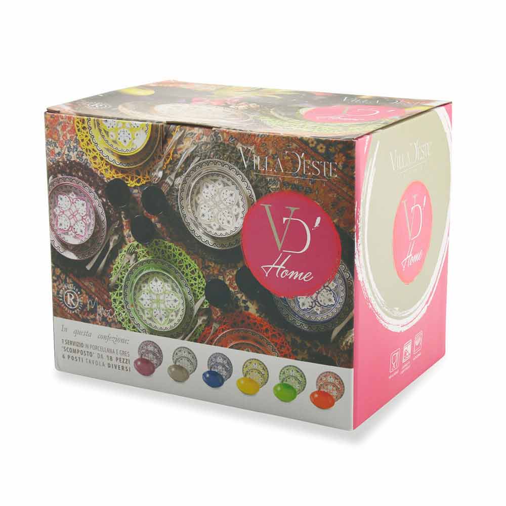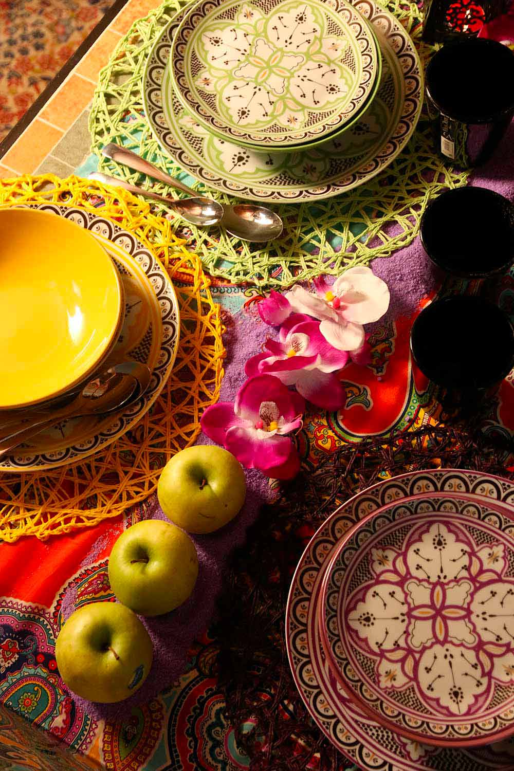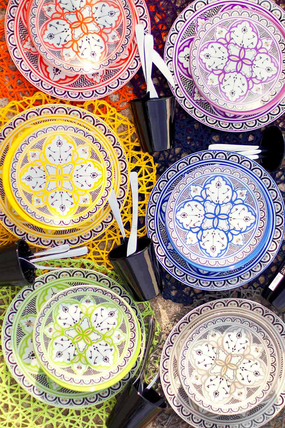 Der Stil dieses Kits, in perfekter Harmonie zwischen der orientalischen und der hispanischen und maurischen Kultur, ist ein klarer Hinweis auf die Geschichte der berühmten und eleganten marokkanischen Keramik mit geometrischen und raffinierten Designs, die jedem Gast eine andere Farbe zuschreiben als alle anderen , um die Philosophie zu symbolisieren, dass jeder auf andere Weise an Geselligkeit teilnimmt .