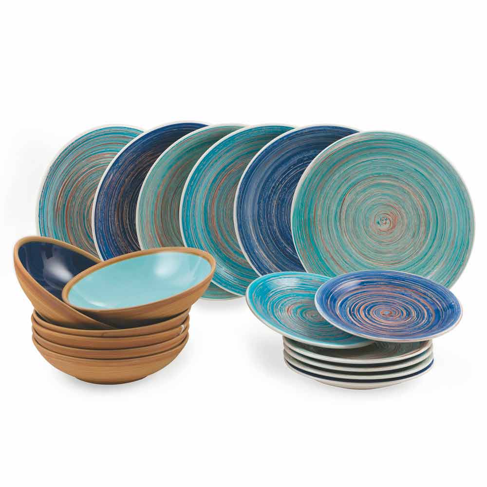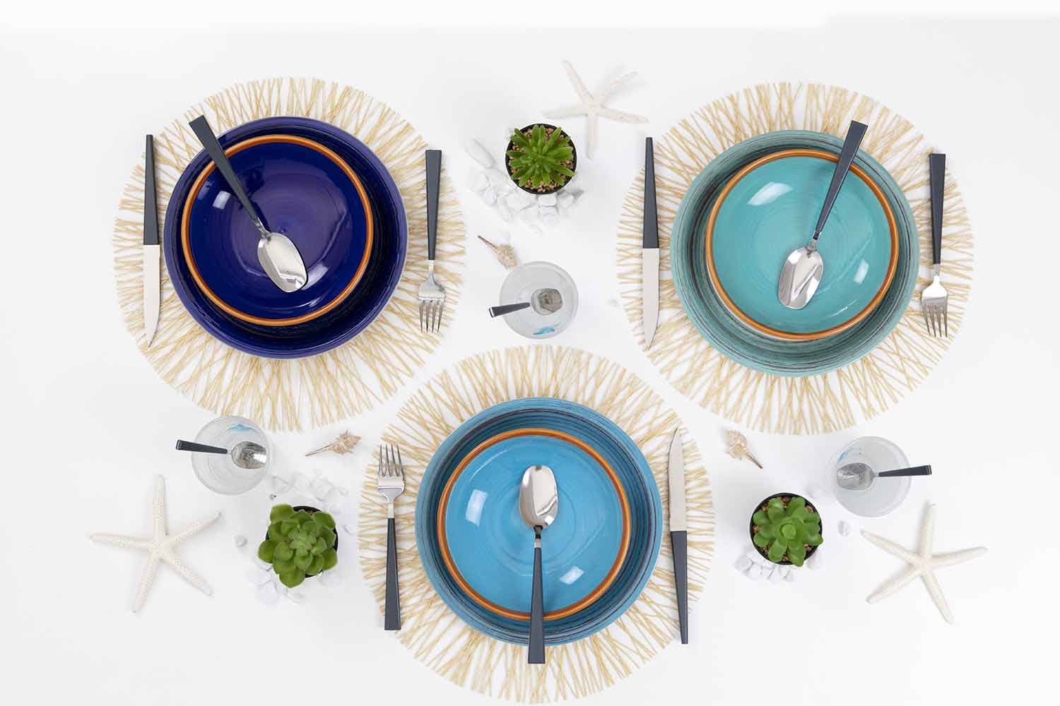 Dieser Service wurde von den Egadi-Inseln des Mittelmeers inspiriert, insbesondere von der Insel Favignana, der Königin des Archipels, für ihre makellose Schönheit und ihre Farben, die auf den Tellern gezeigt werden, mit denen sich das Blau des Meeres mit seinen Schattierungen schneidet Die Adern auf Beige erinnern an warmweißen Sand.
