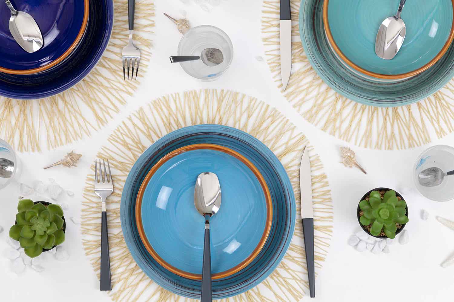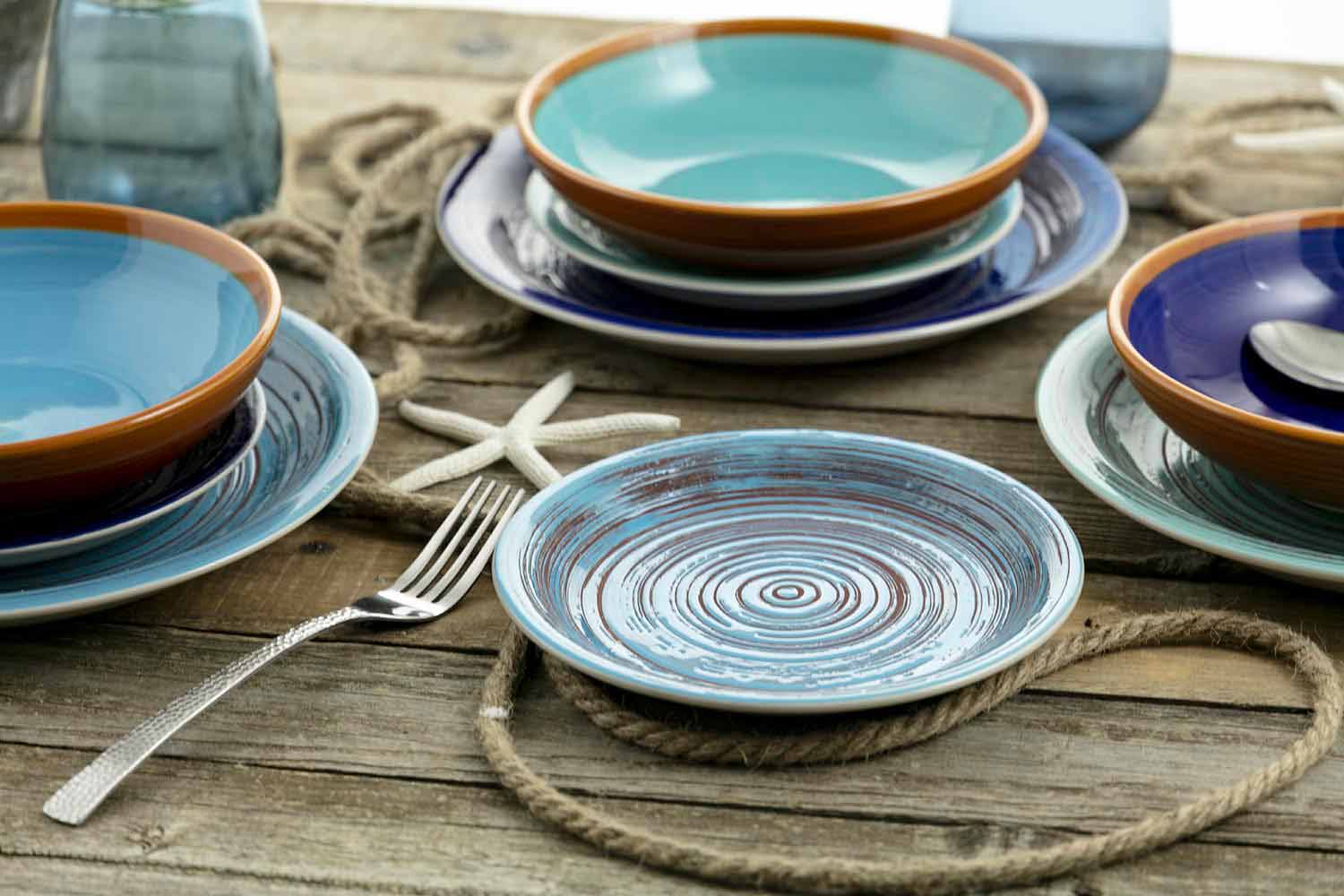 Bunte und moderne 18-teilige Steinzeuggeschirr, kompletter Tischservice.