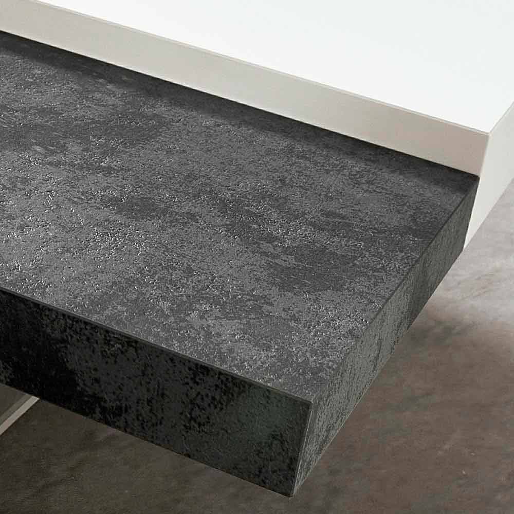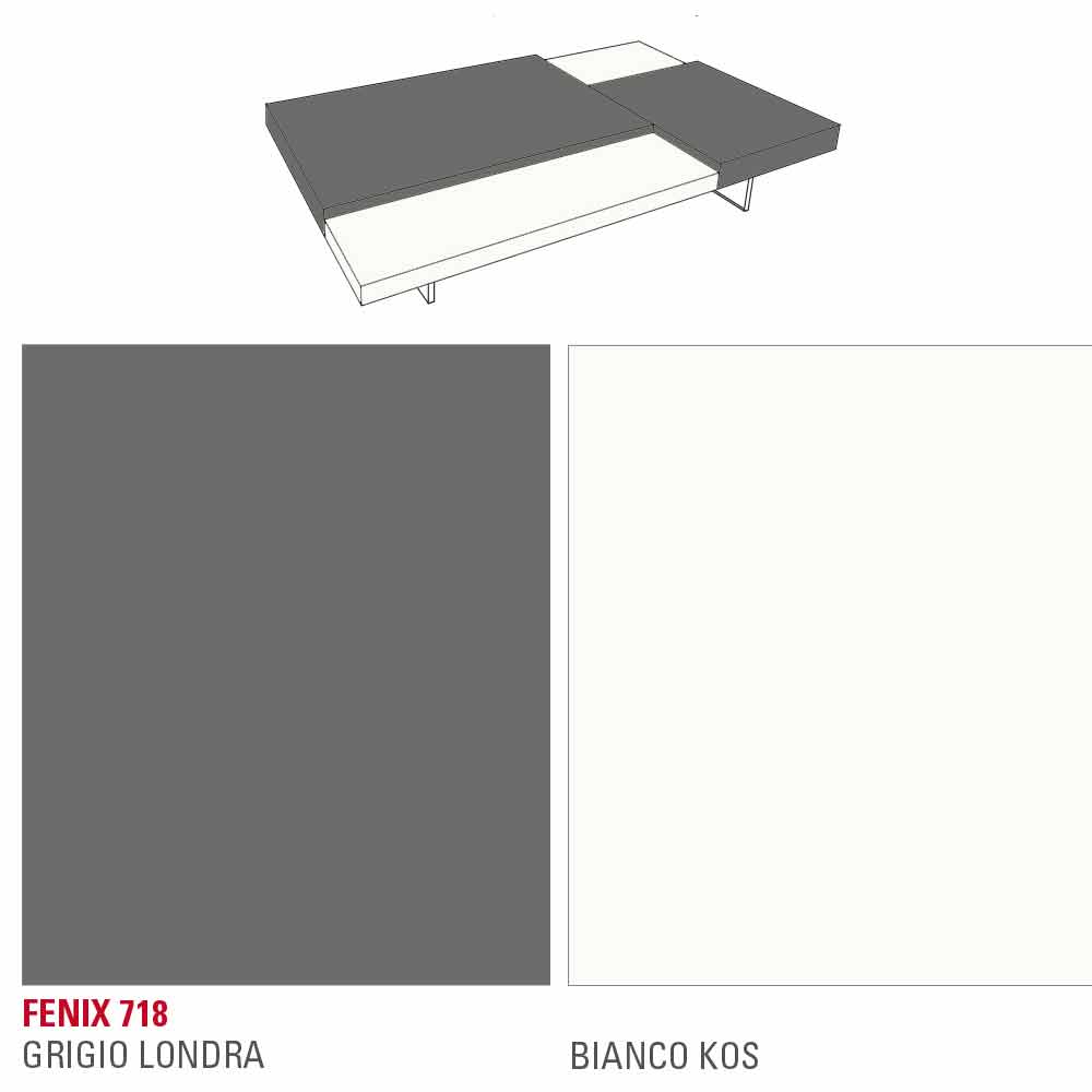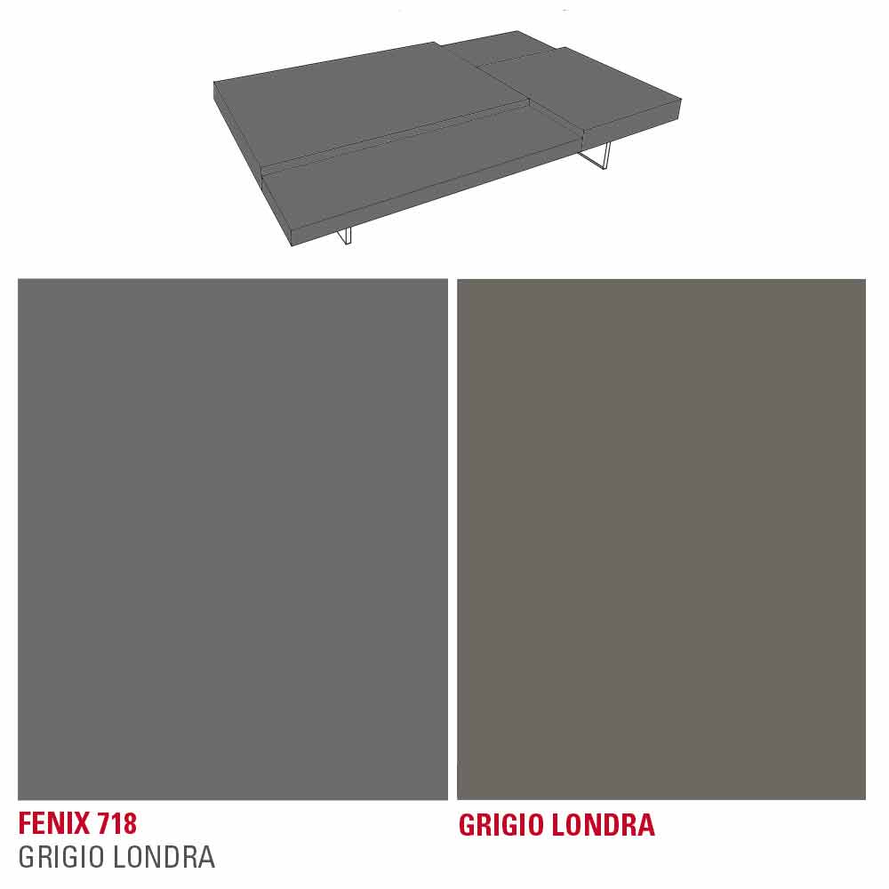 Couchtisch mit HPL-Platten und Fenix- beschichteten Platten, die von einer Melaminplatte und transparenten Polymethylmethacrylat- Füßen getragen werden. In jedem Wohnzimmer ist das Vorhandensein eines Couchtisches unerlässlich, der nicht nur eine praktische und funktionale Ablagefläche darstellt, sondern auch den Möbeln Harmonie verleiht und ihre Ästhetik dank fesselnder und origineller Linien und Formen vervollständigt. Dieses Möbelstück verkörpert alle grundlegenden Eigenschaften eines perfekten Couchtisches und erweist sich als eine ausgezeichnete Idee für diejenigen, die es lieben, ihre Räume mit Elementen in einem einfachen, aber wirkungsvollen Stil zu dekorieren. Die besondere Form der Platten in unterschiedlichen Höhen spielt eine wichtige Rolle im Design des Produkts, da sie ein exklusives Spiel mit Kontrasten bietet. Darüber hinaus führen die 100% Made in Italy-Verarbeitung und die Verwendung von Rohstoffen wie Fenix zur Schaffung eines besonders widerstandsfähigen Produkts, das sich angenehm anfühlt und extrem blickdicht ist .
