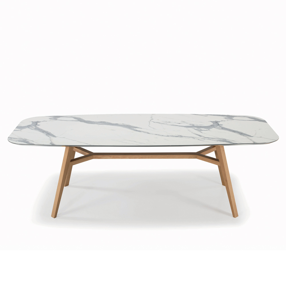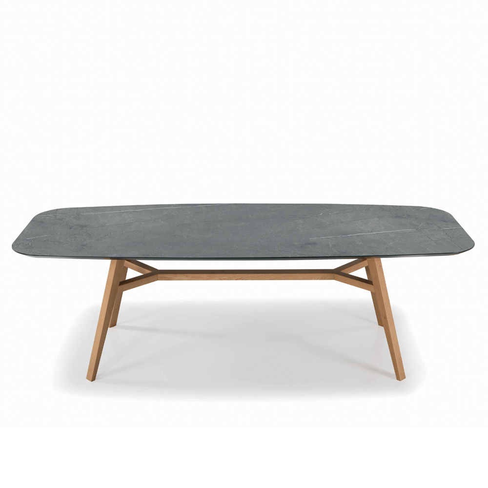 Fester, tonnenförmiger Wohnzimmertisch mit Laminatplatte,30° abgeschrägter Kante, Untergestell aus Eschenholz mit natürlichem Eichenfinish . Dieses Produkt mit modernem Stil hat das Hauptziel, täglich verwendet werden zu können, ohne auf Design zu verzichten. Die Produktkette, von der Konzeption über die Produktion bis hin zur Qualitätskontrolle, wird vollständig in Italien durchgeführt, um die typischen Merkmale des italienischen „Know-hows“ und die Bedeutung des typischen Made in Italy zu gewährleisten und zu bewahren.