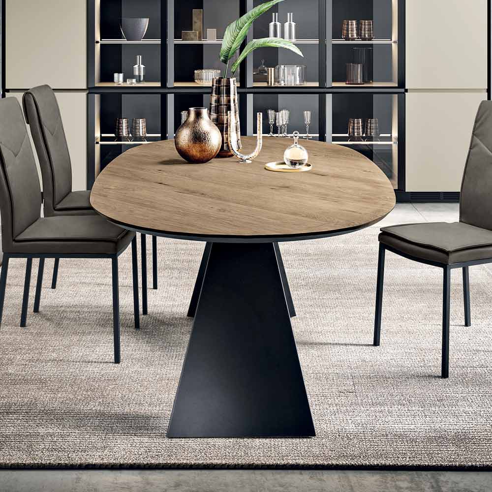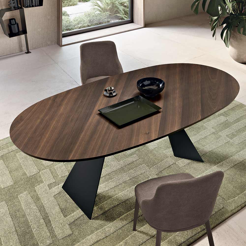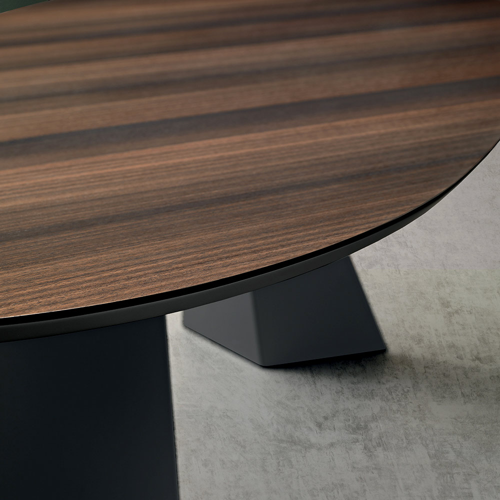 Die ovale Form der Tischplatte verleiht dem Tisch optische Leichtigkeit und ermöglicht flexible Sitzordnungen, wodurch er sich ideal für gesellige Runden und moderne Einrichtungen eignet. Die Holzoberfläche unterstreicht die natürliche Wärme des Materials und schafft so ein harmonisches Gleichgewicht zwischen Eleganz und optischer Behaglichkeit.