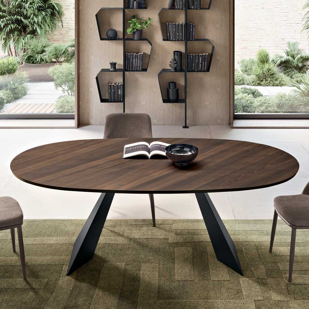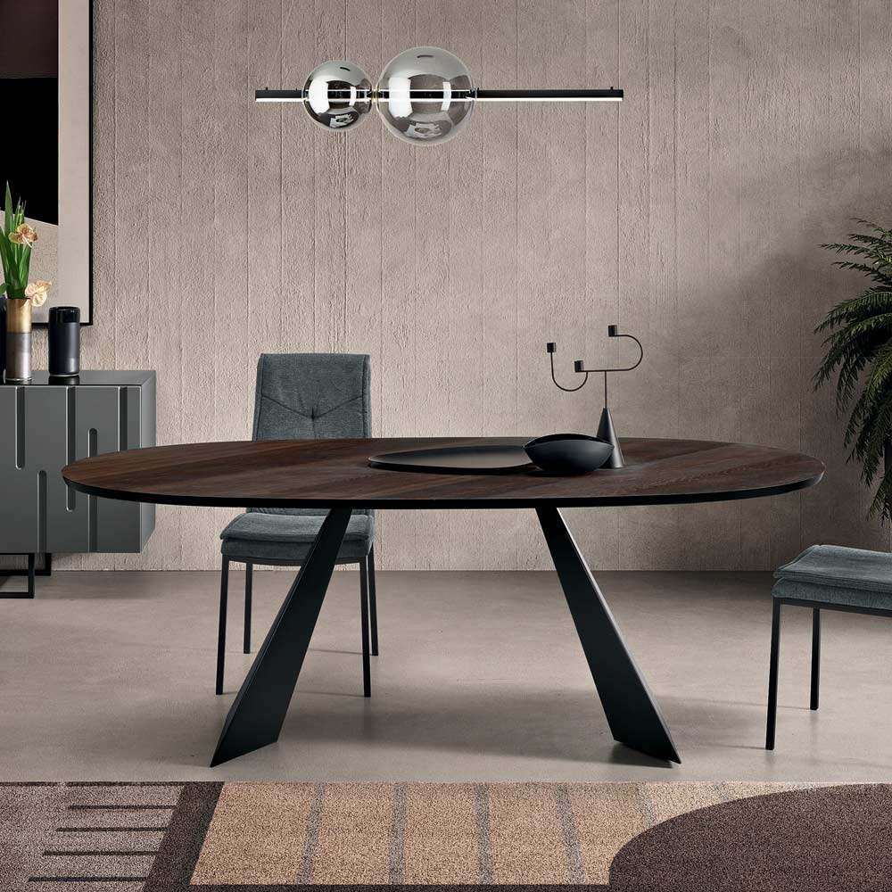 Die schwarz lackierte Metallstruktur mit ihrem geometrischen und soliden Design bildet einen angenehmen Kontrast zur Rundung der Tischplatte, unterstreicht den modernen Charakter des Tisches und gewährleistet Stabilität und Robustheit.