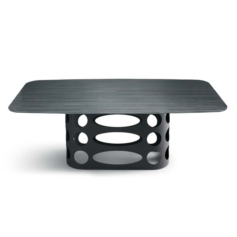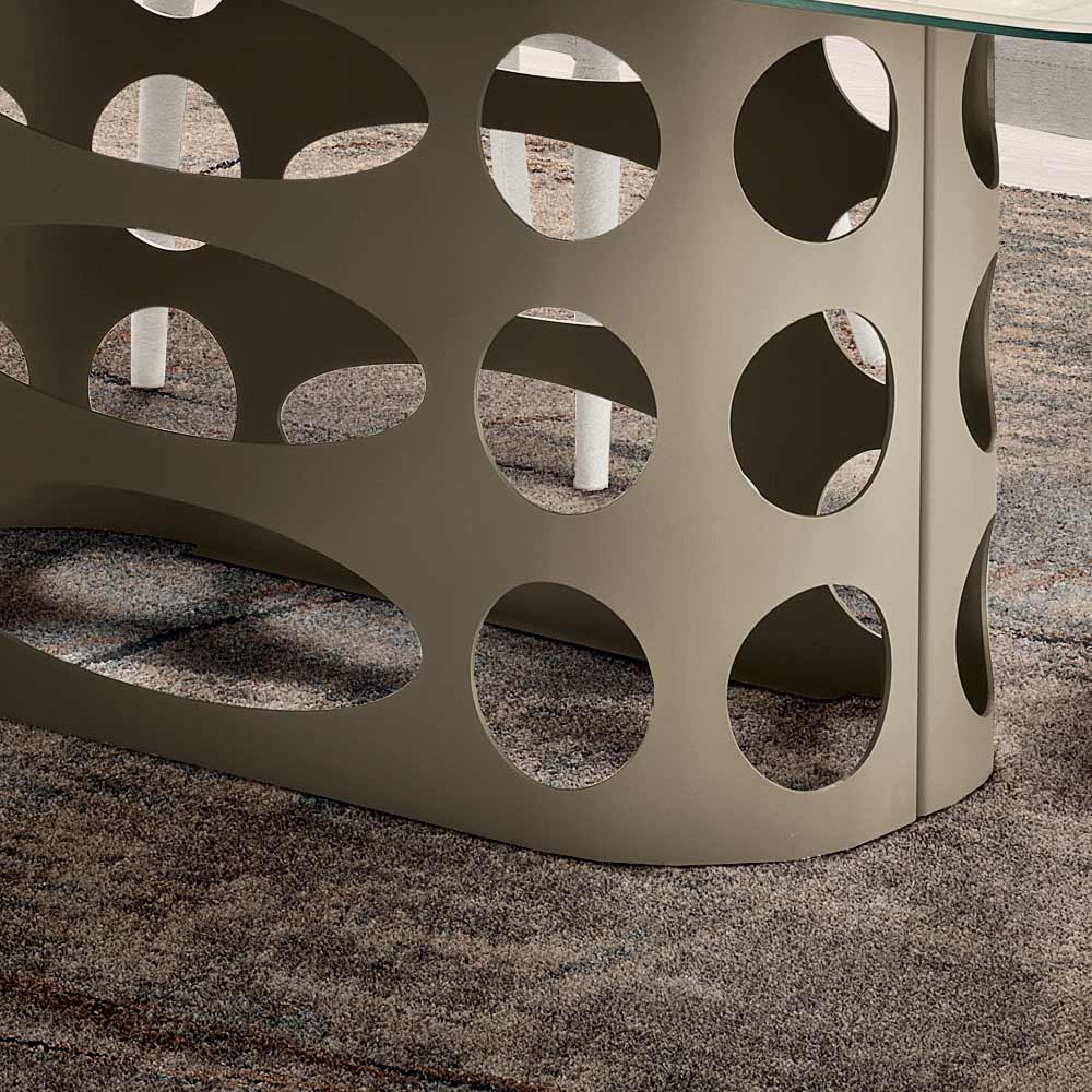 Ein eleganter, in Italien gefertigter Designer-Esstisch , ideal für die stilvolle Einrichtung Ihres Ess- oder Wohnbereichs . Der Tisch besticht durch sein originelles, lackiertes Metallgestell mit eleganten elliptischen und kreisförmigen Perforationen , die ein faszinierendes grafisches Spiel von Masse und Leere erzeugen und der Struktur einen ausgeprägten dekorativen Charakter verleihen.
