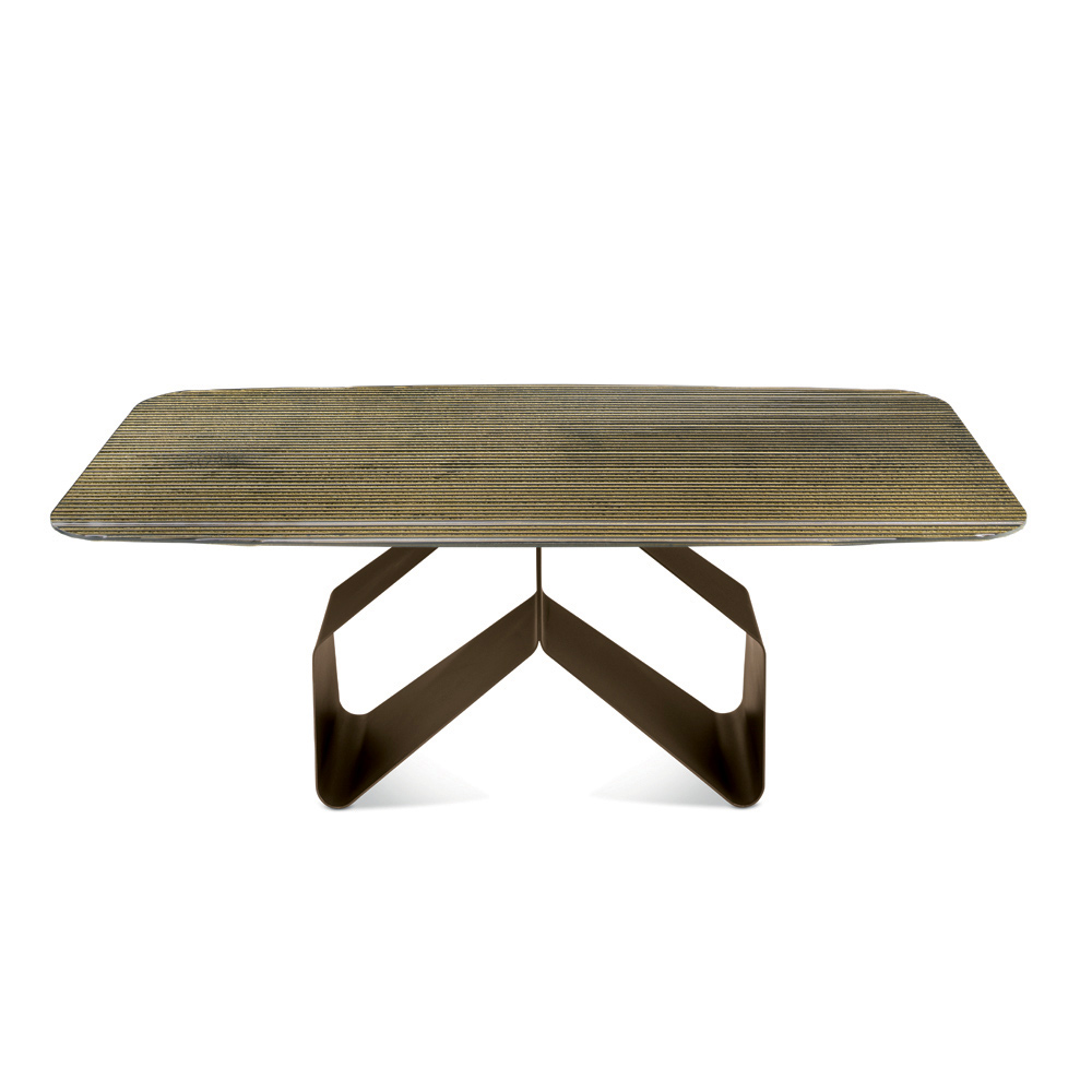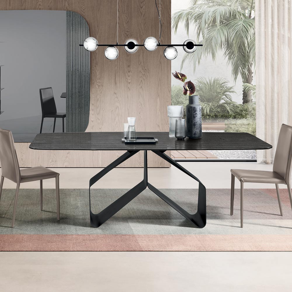 Ein eleganter, in Italien gefertigter Designertisch, der Ihr Esszimmer oder Wohnzimmer stilvoll aufwertet. Der Tisch besticht durch sein originelles , lackiertes Metallgestell mit einer leichten und dynamischen grafischen Struktur, die an zwei stilisierte Flügel erinnert und so eine starke ästhetische Wirkung bei gleichzeitig harmonischer Optik erzielt.