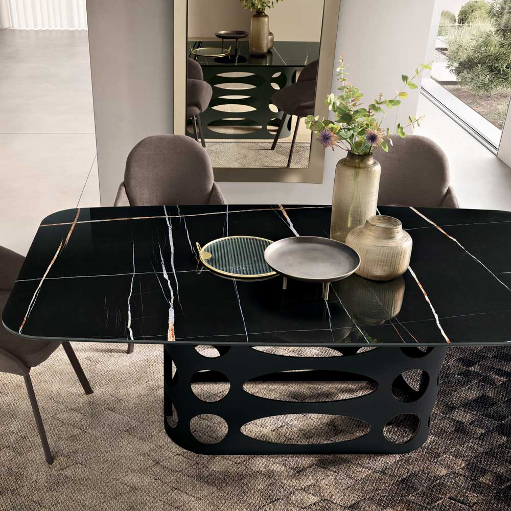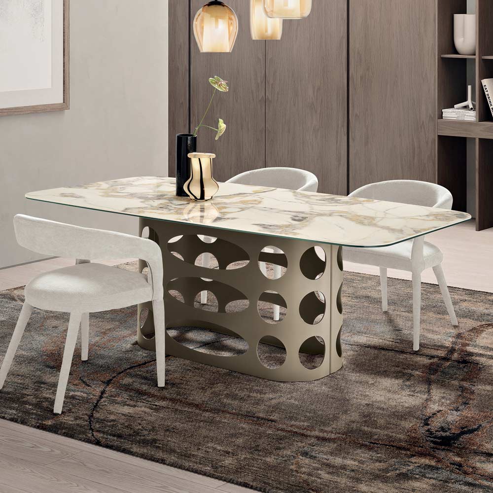 Ein eleganter, in Italien gefertigter Designertisch , ideal für die stilvolle Einrichtung Ihres Ess- oder Wohnbereichs . Der Tisch besticht durch ein originelles , lackiertes Metallgestell mit raffinierten elliptischen und kreisförmigen Perforationen – ein markantes Detail, das ein faszinierendes grafisches Spiel von Masse und Leere erzeugt und die Struktur leicht und zugleich ausdrucksstark wirken lässt.